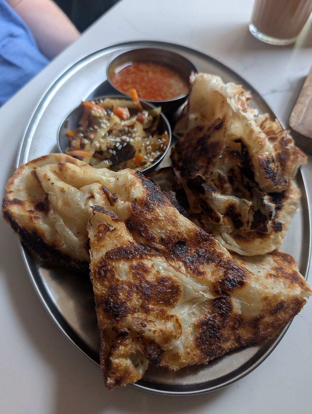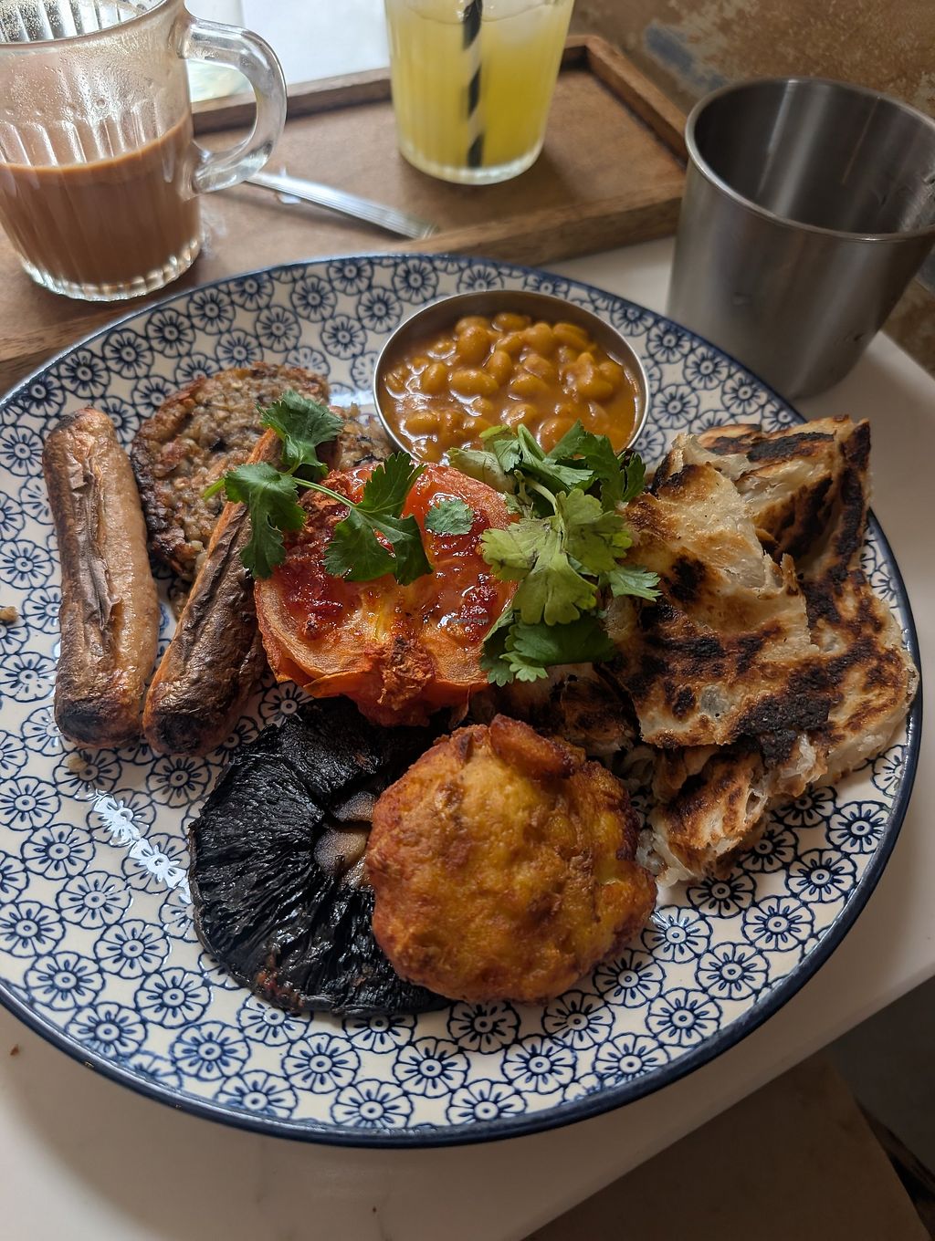 Love that they can veganise the condensed milk tea and coffees. However, there are only a couple vegan options - the vegan breakfast is the veggie one but with cheese and egg removed with no replacement. Sausages are Richmond. Worth a try if there's not a long wait. Recommend the roti with curry dip!