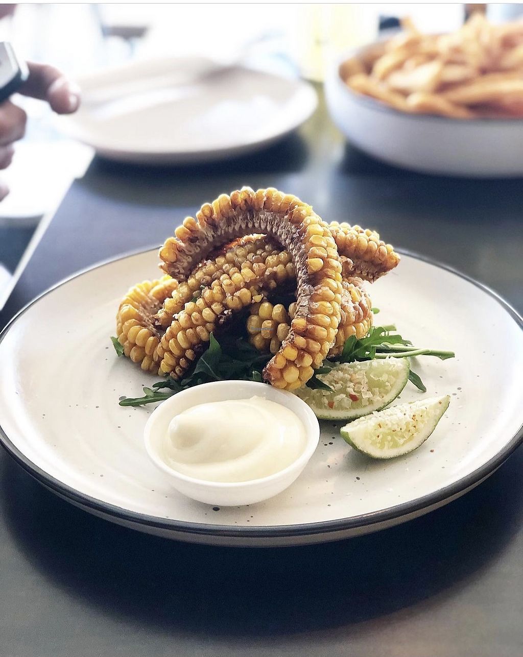 Fried corn ‘ribs’ tossed in chilli salt and served with vegan lime aio…
