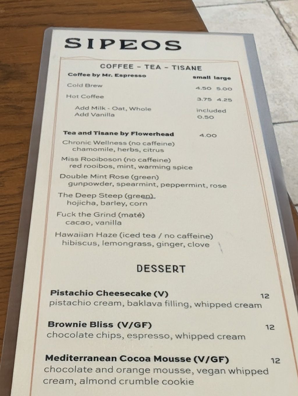 We had lovely dinner at Sipeos. The shaved fennel and citrus salad was super fresh and with just the right amount of dressing. The impossible kefta were delicious. We also had the vegan soft serve for dessert, which was excellent.