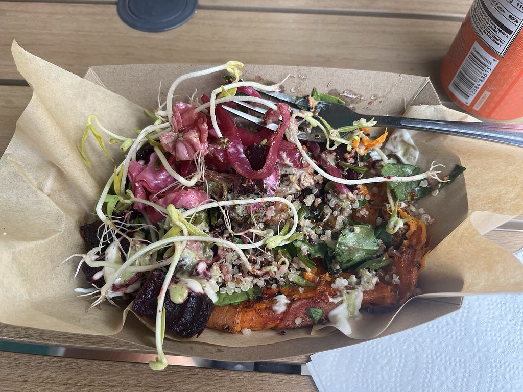 loaded sweet potato with baked tofu, pickled cabbage & onions, roasted…