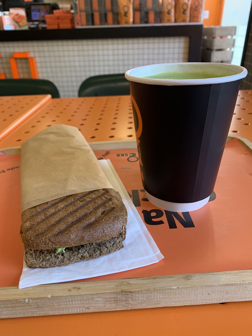 Vegan sandwich on whole grain bread and a green tonic juice 😍