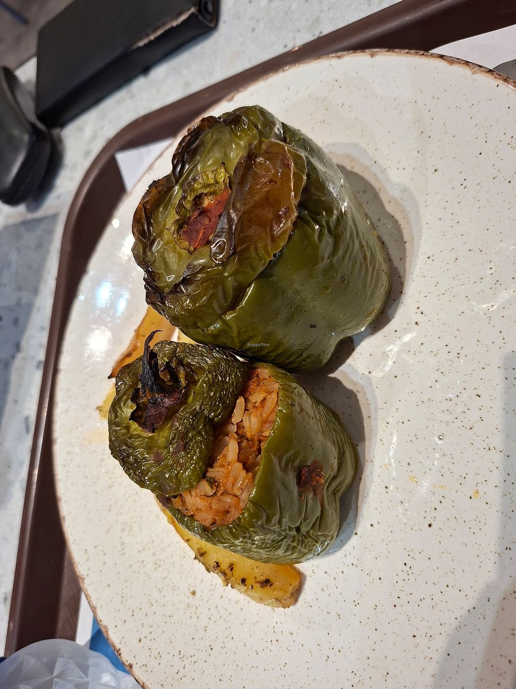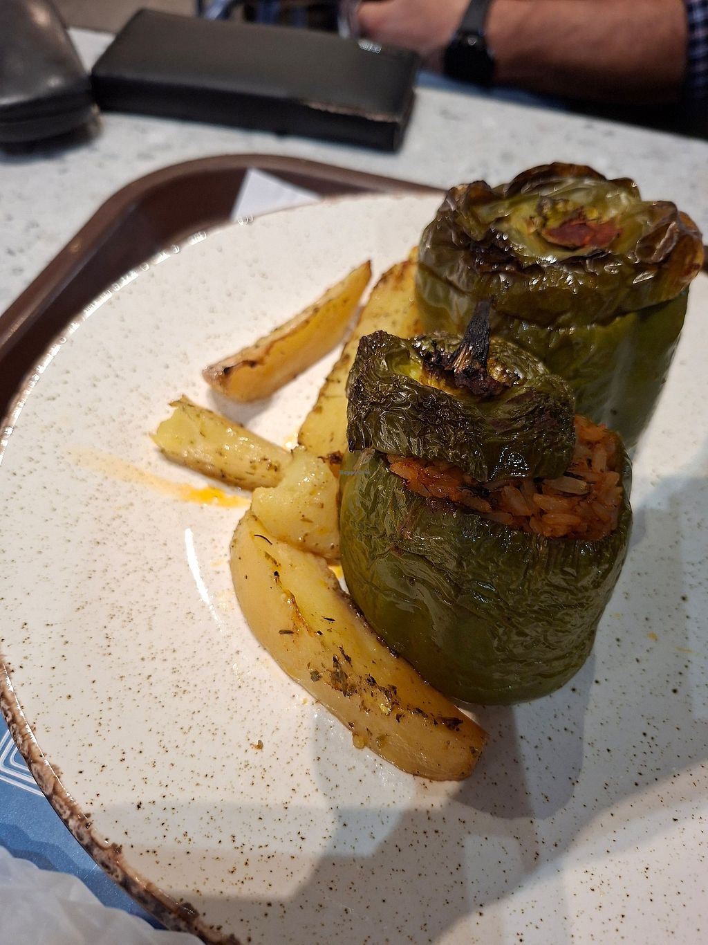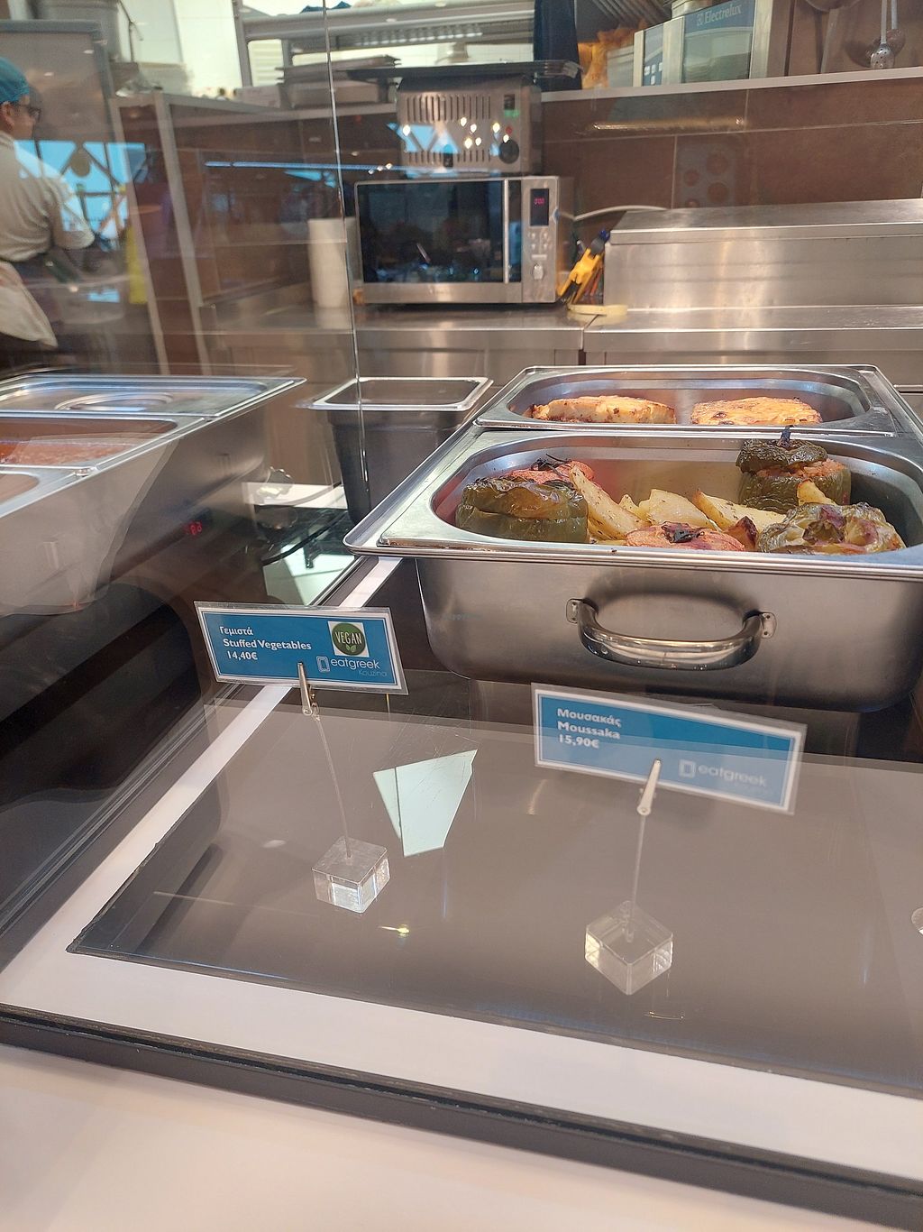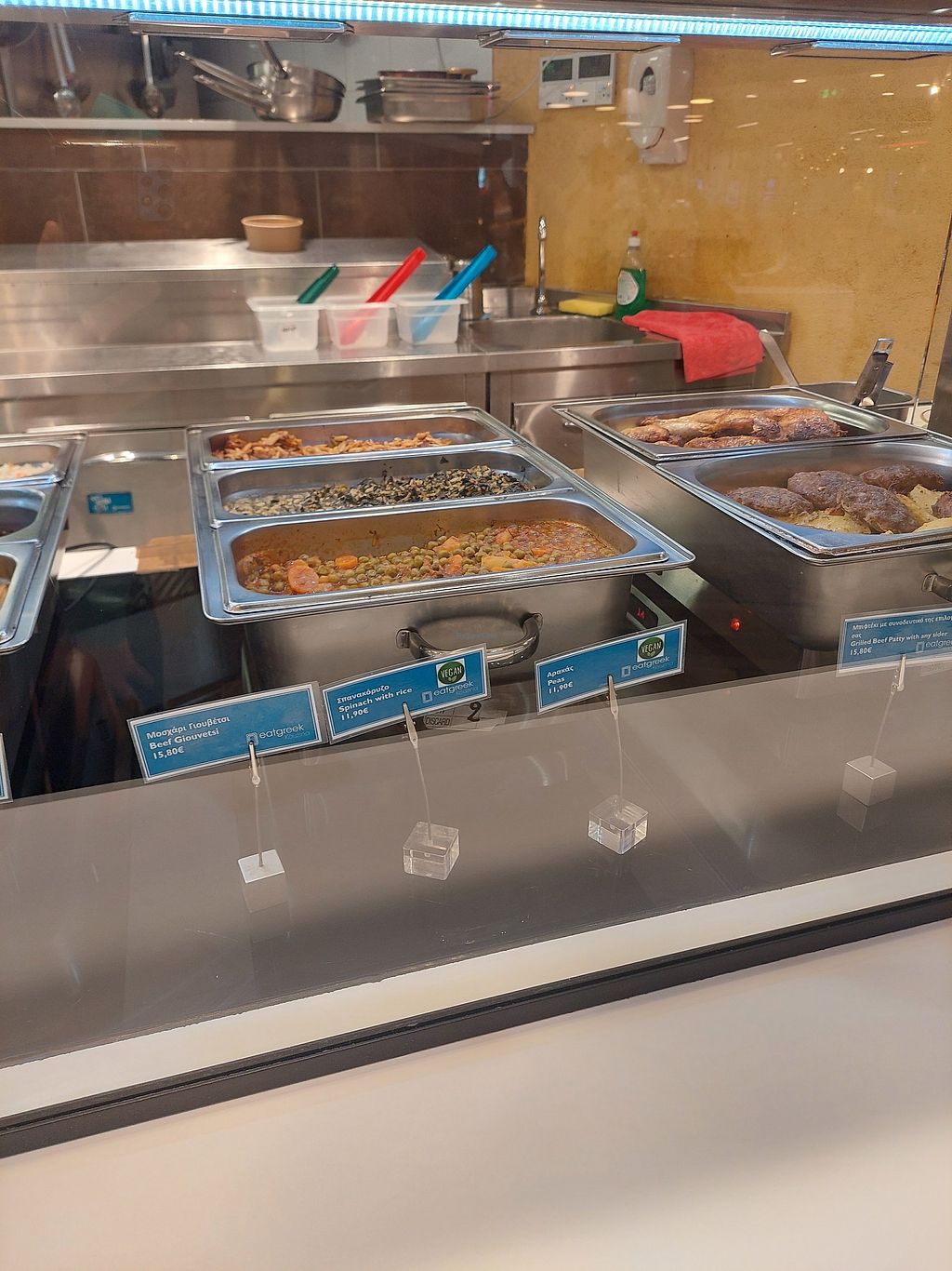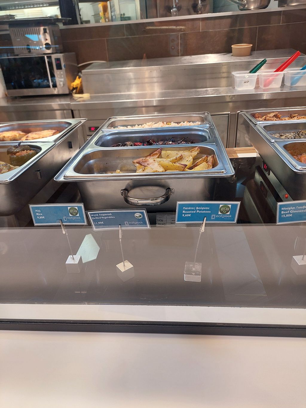 Serves meat, vegan options available. Restaurant inside the airport offering clearly labeled vegan options such as vegan potato pie, vegan stuffed vegetables, and vegan spinach with rice. Open Mon-Fri 10:00am-2:00am, Sat-Sun 10:00am-3:00am.
