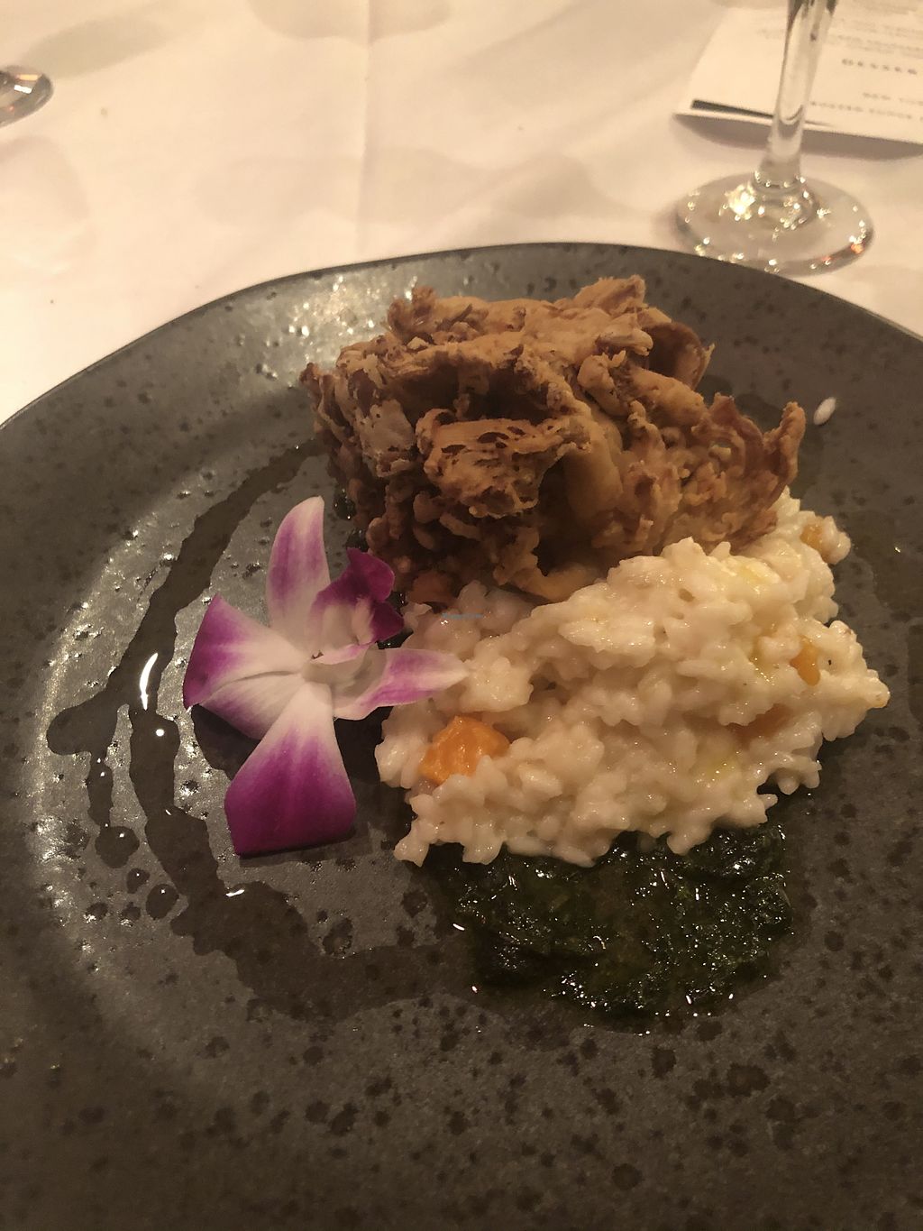 Beautiful restaurant great outdoor seating. Loved listening to the waterfall and seeing the pretty lights. Two vegan entrees, vegan “scallops” and jackfruit tacos. Cody, our waiter, was AWESOME. Fabulous service.