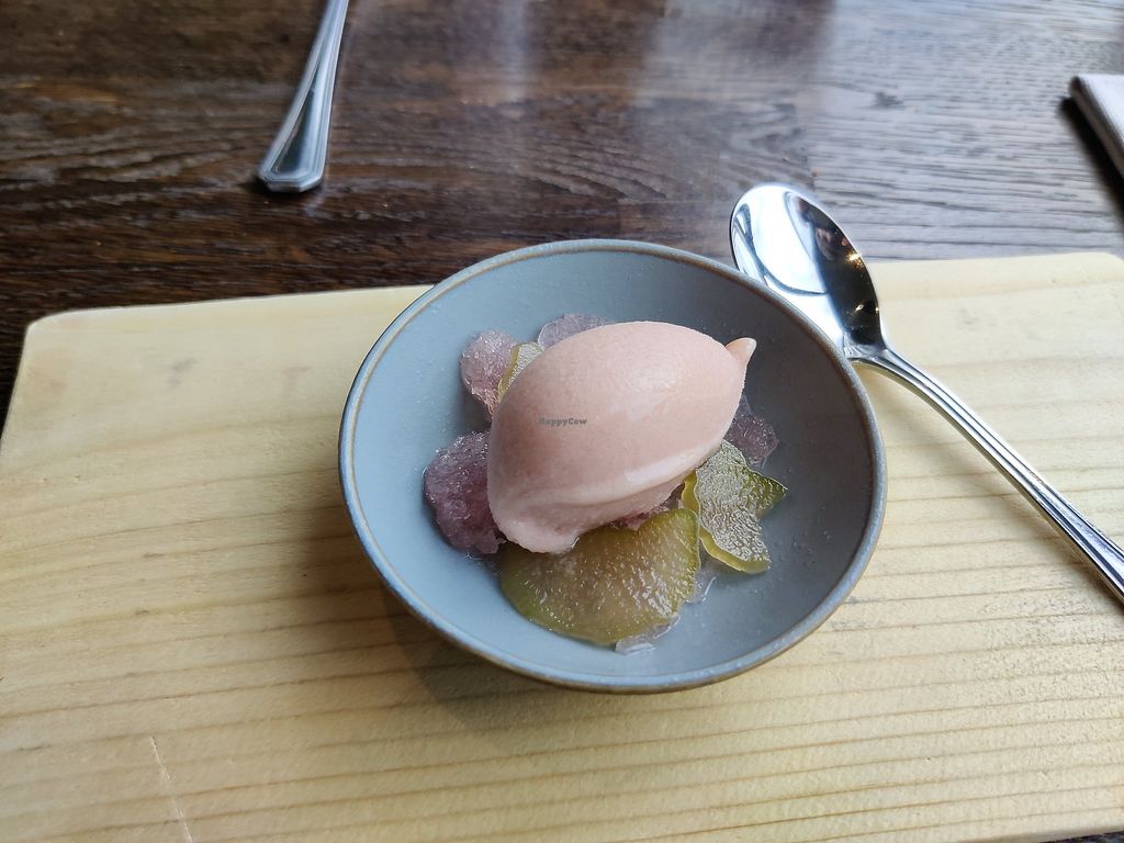 Pre-dessert: rhubarb sorbet or ice cream with some other rhubarb sweet…