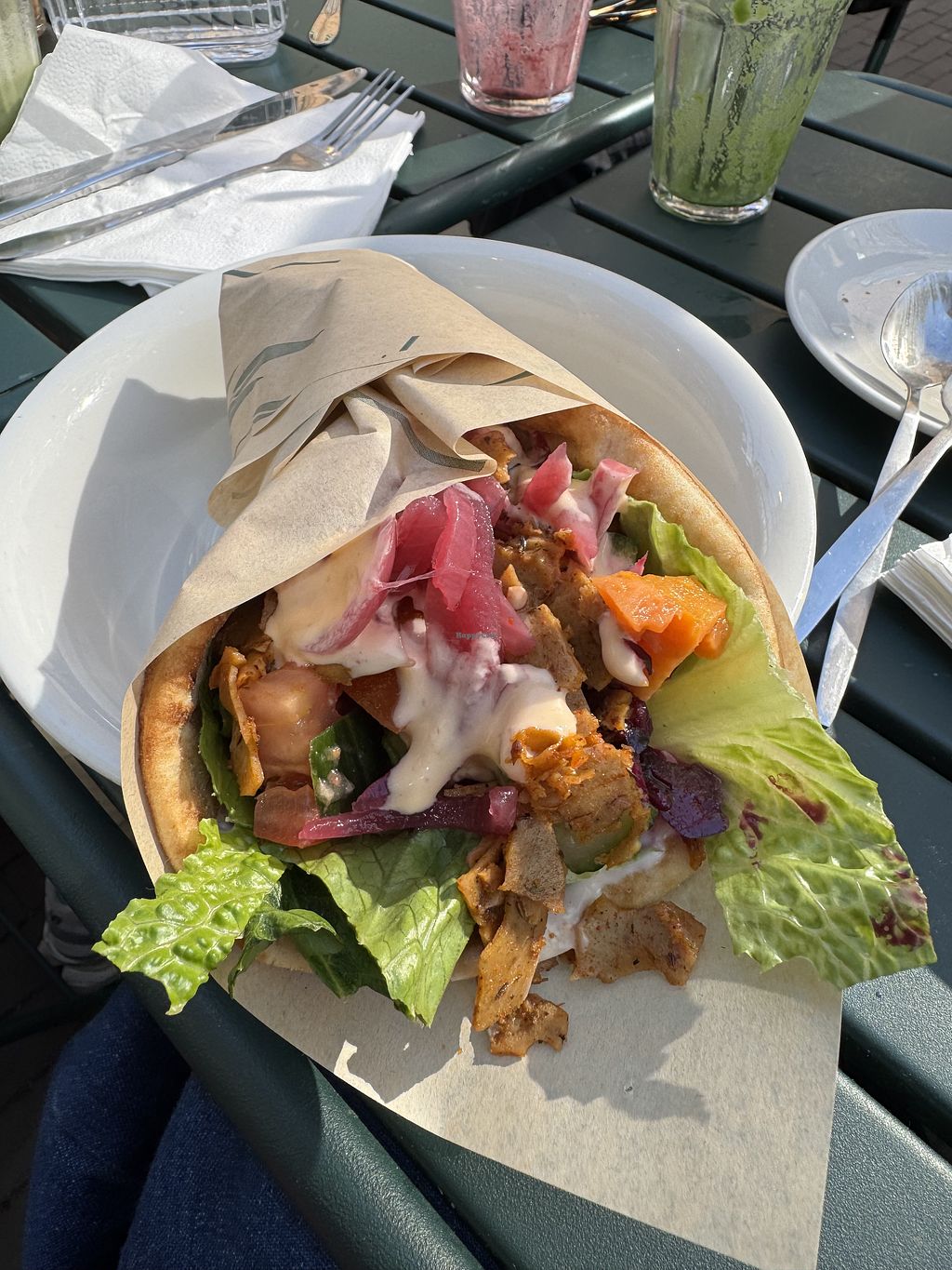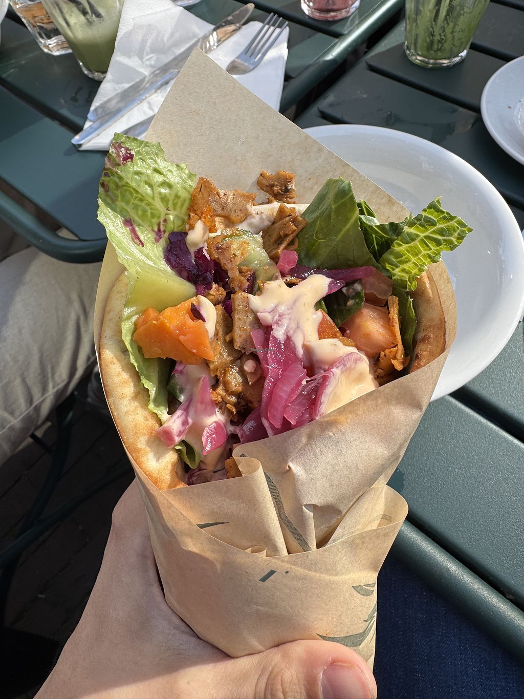 Een vegan groente wrap gegeten en kombucha, super lekker. Vriendelijk personeel en genoeg vegan keuzes