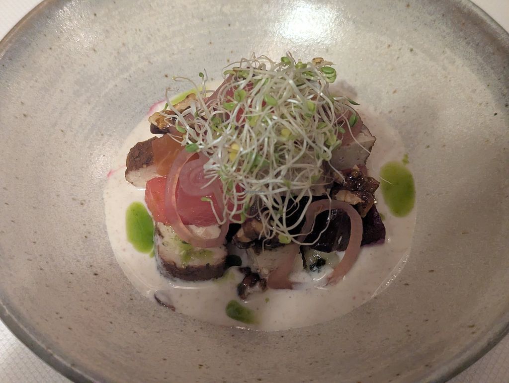 Serves meat, vegan options available. Upmarket fine dining restaurant offering a vegan & seasonal chef's tasting menu on request. Examples of dishes include beetroot, watermelon & smoked tofu with candied walnuts, sliced panko oyster mushroom & zucchini on a bed of vermicelli noodles with stir fried vegetables and chocolate delice with vegan vanilla ice cream. Open Tue-Sat 12:00pm-9:30pm. Closed Sun & Mon.