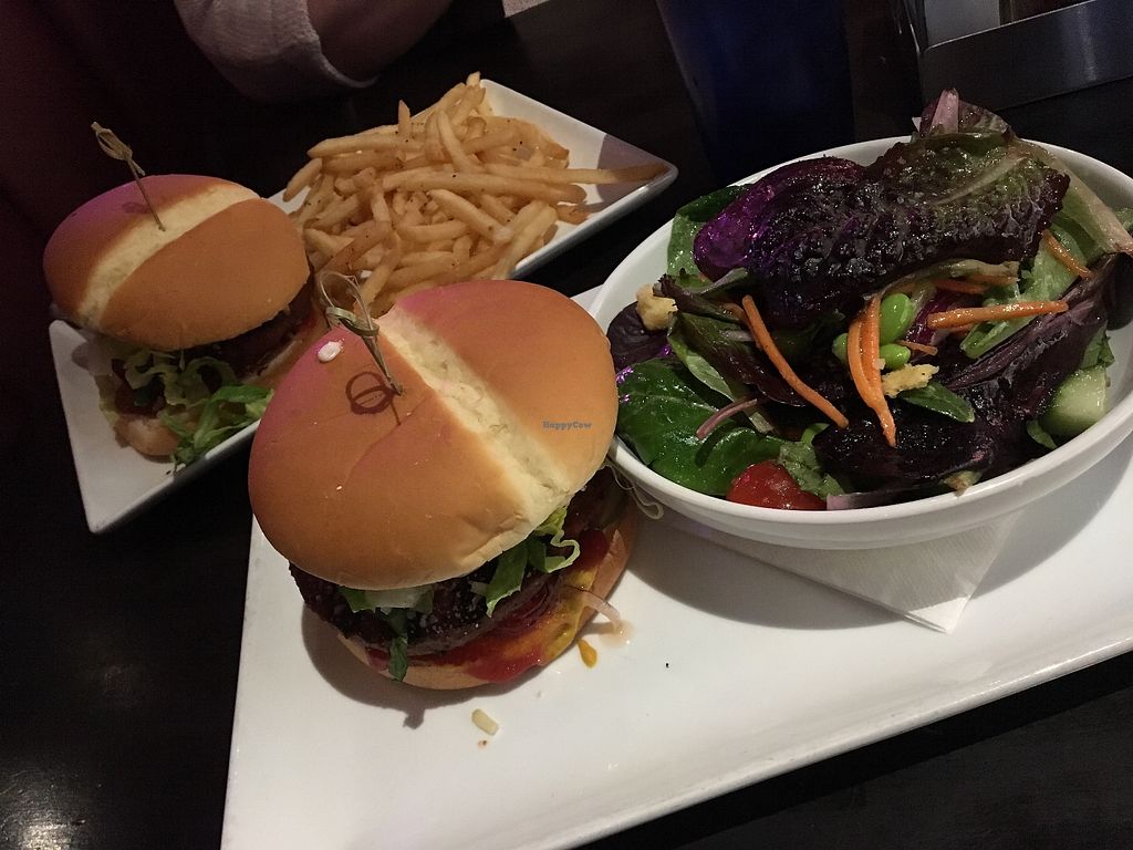 vegan meatball sub, fries cooked in a separate fryer, and side salad w…