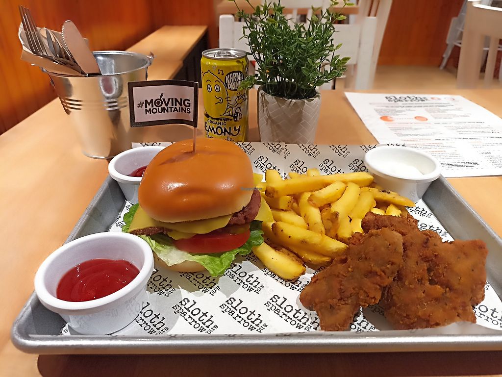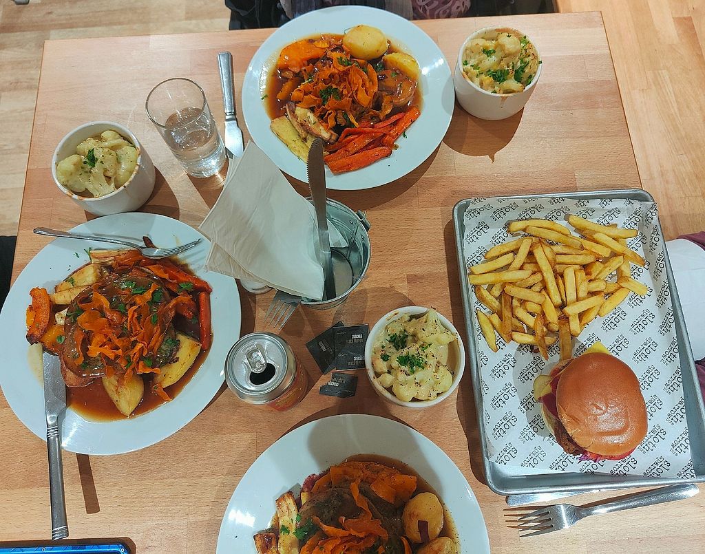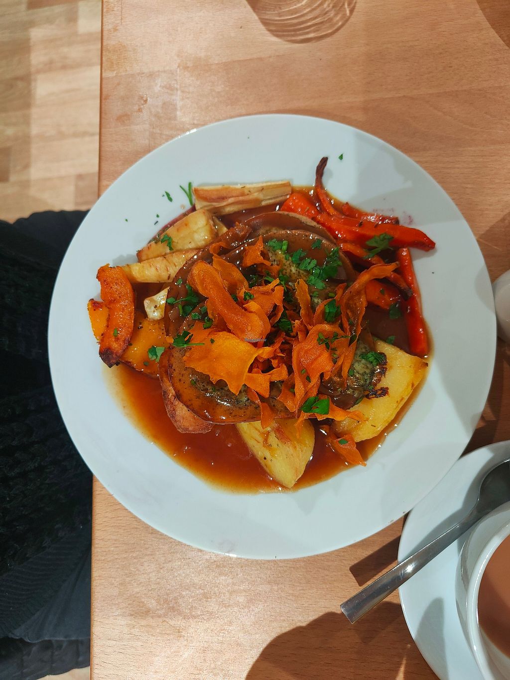 We went to the sloth and sparrow on a Sunday and their roast dinner wad delicious. Lots of veggies. I had the nut roast and my other half had the roast seitan. Both were flavourful and delicious.