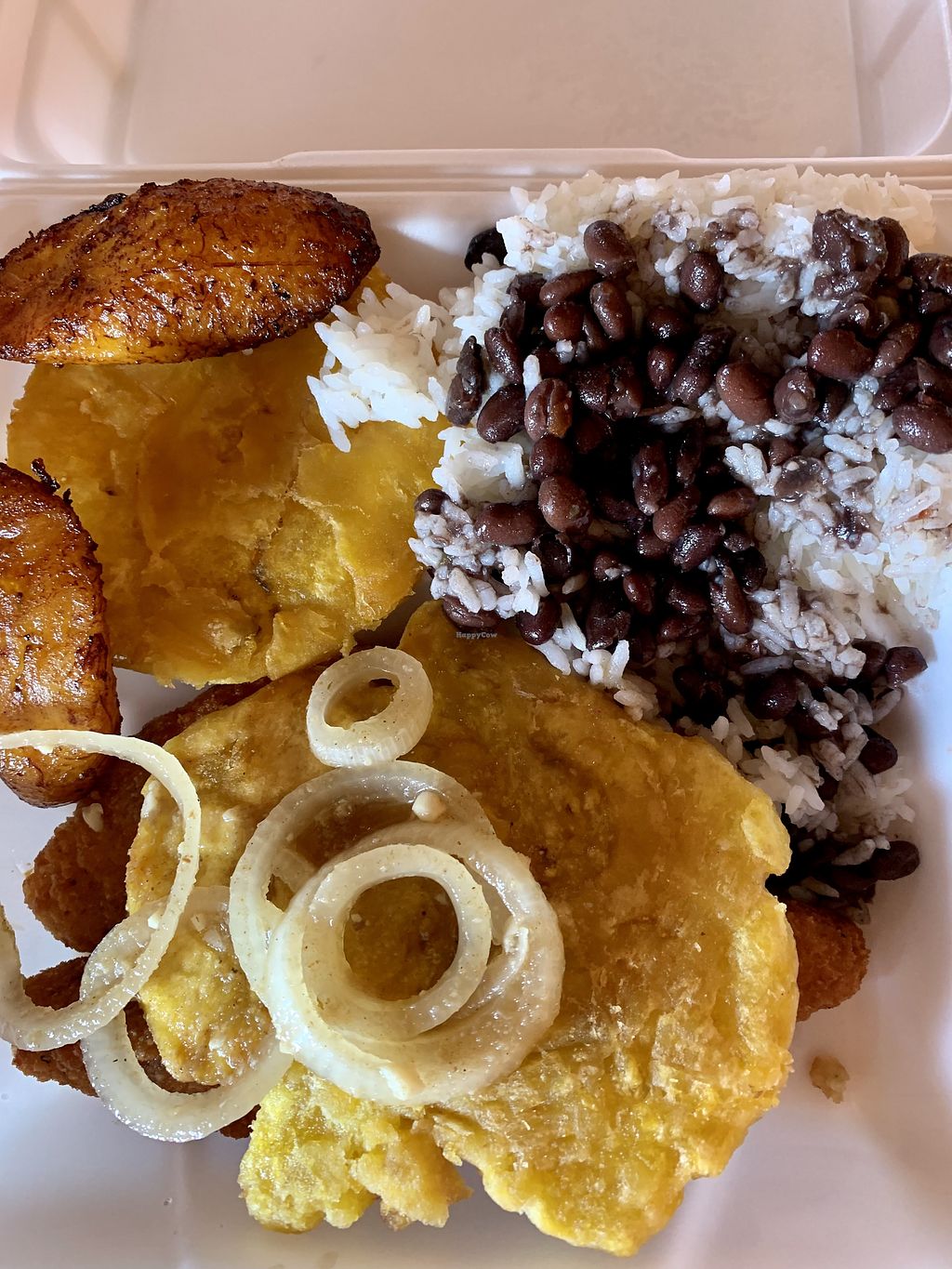 Vegan picadillo with tostones, black beans, and white rice.