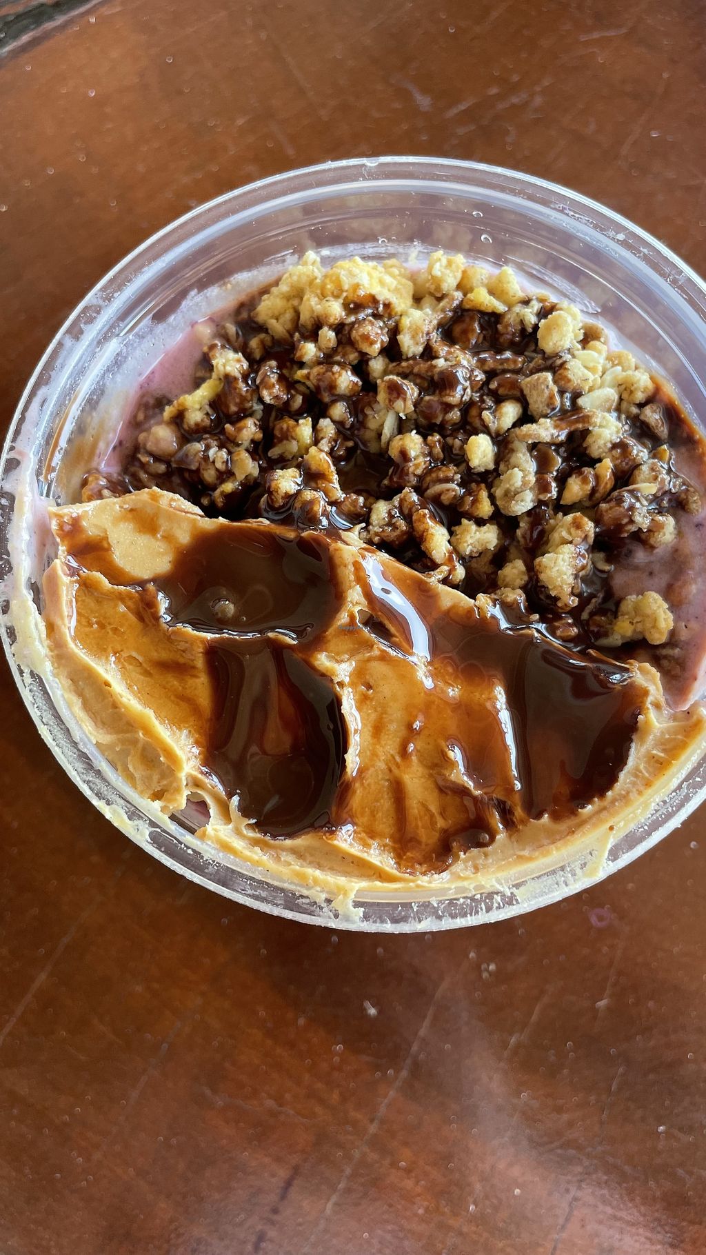 My custom toppings: crunchy sugar-free granola, peanut butter, and veg…