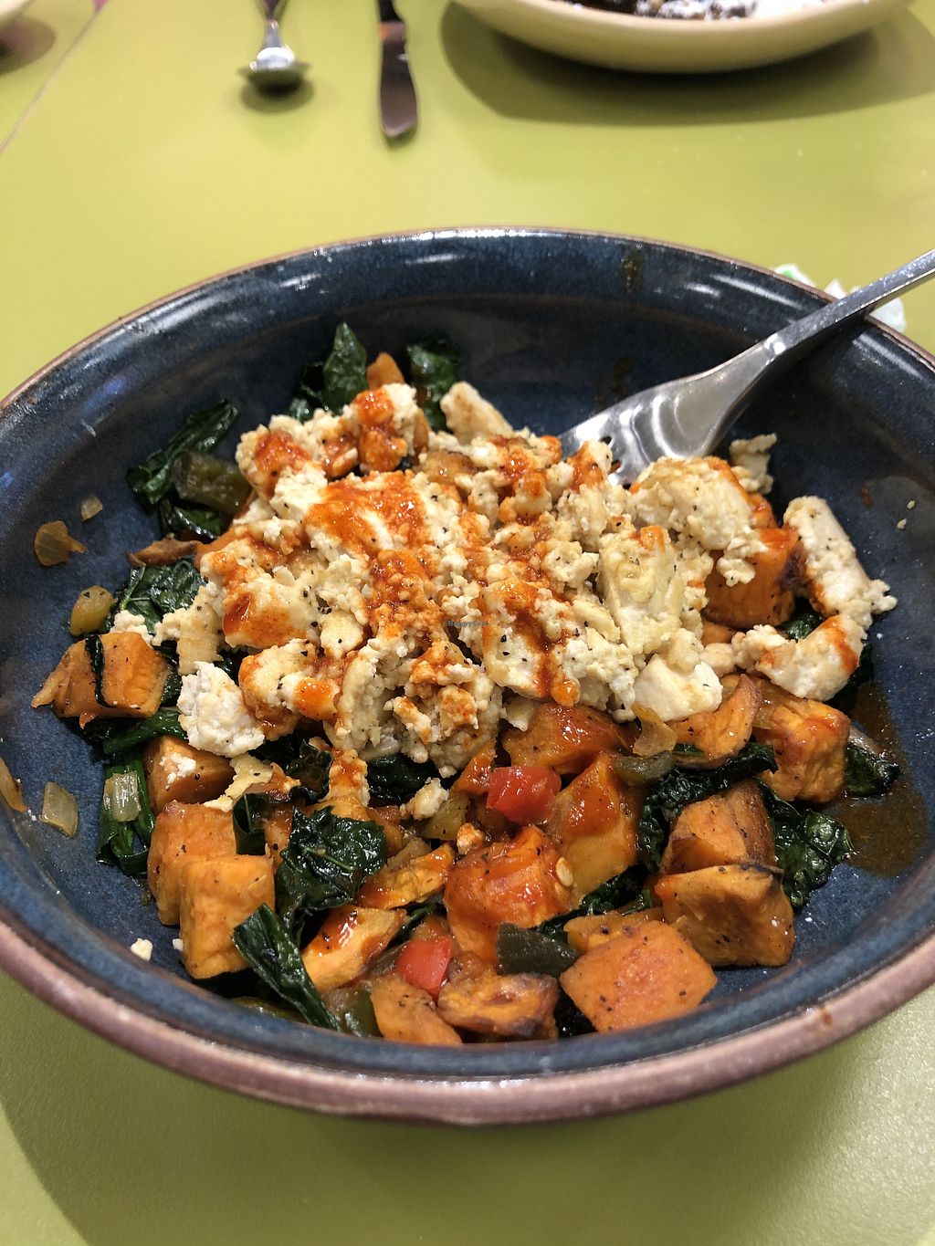 Servers have a sheet of what can be made vegan. Said kitchen is working on having more vegan options. Sweet Potato Hash with tofu was delicious!