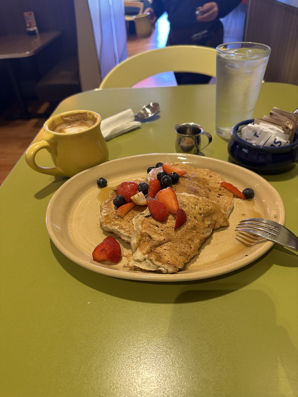 The only vegan option clearly marked on their menu is the Vegan Banana Bliss Pancakes, and you can make the Tofu Scramble vegan. So two options. The pancakes were way too chewy for me, reminds me of vegan pancake recipes a decade ago that attempted to get around their bad taste by covering them in berries, fruits, and or chocolate. The soy latte was pretty good.