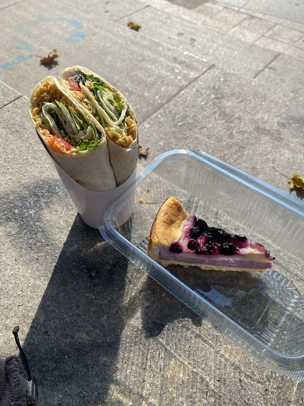 Surprisingly good cheesecake and Falafel wrap, clearly marked
