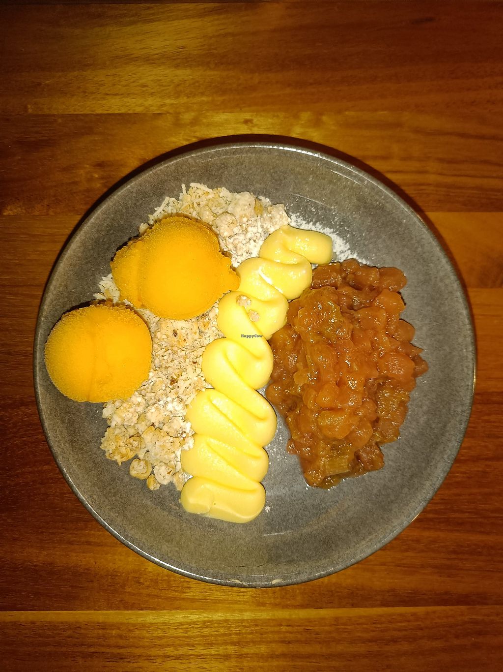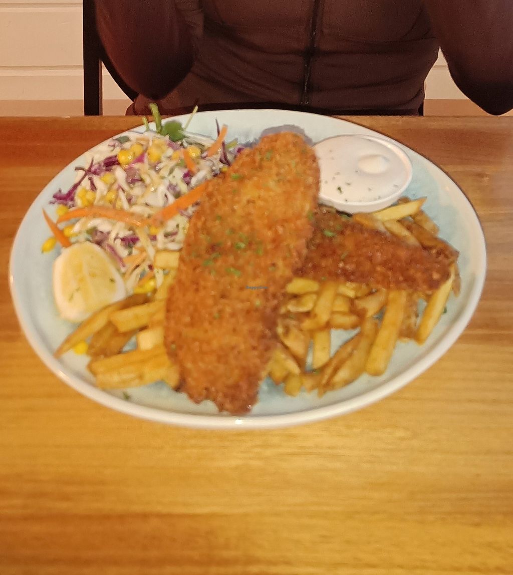 We had the vegan fish and chips (banana blossom) which were super tasty and the Apple Rhubarb dessert which was amazingly delicious 😁