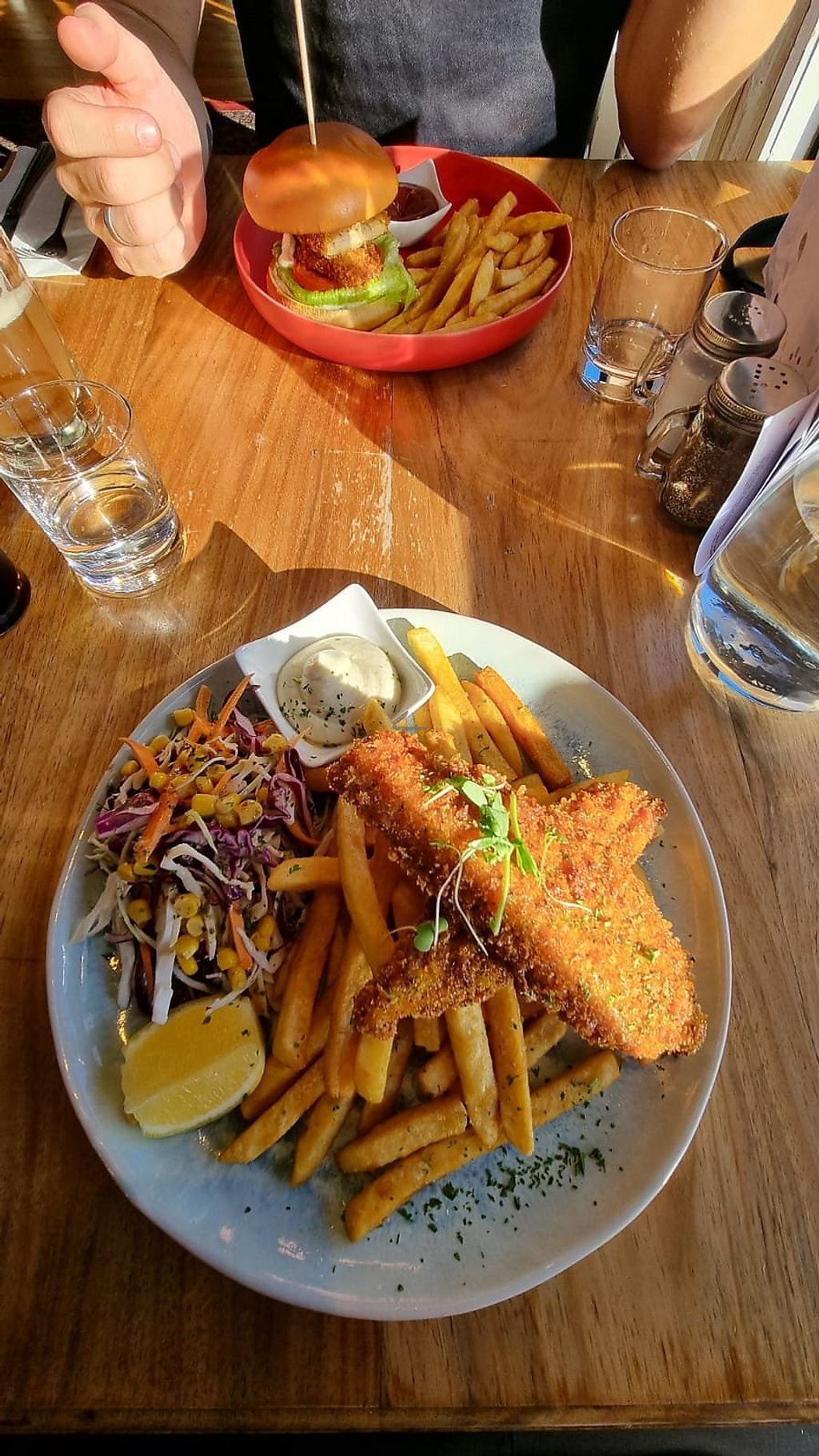 Generally all the options were banana blossom (fish and chips, burger or tacos) but it was a really good portion, and they let me swap to sweet potato fries and didn't charge extra. It was a nice setting with a lively view of the lake. They also had apple crumble for dessert but for me was too much so didn't try. I was driving but they had some nice cider flavours too.
