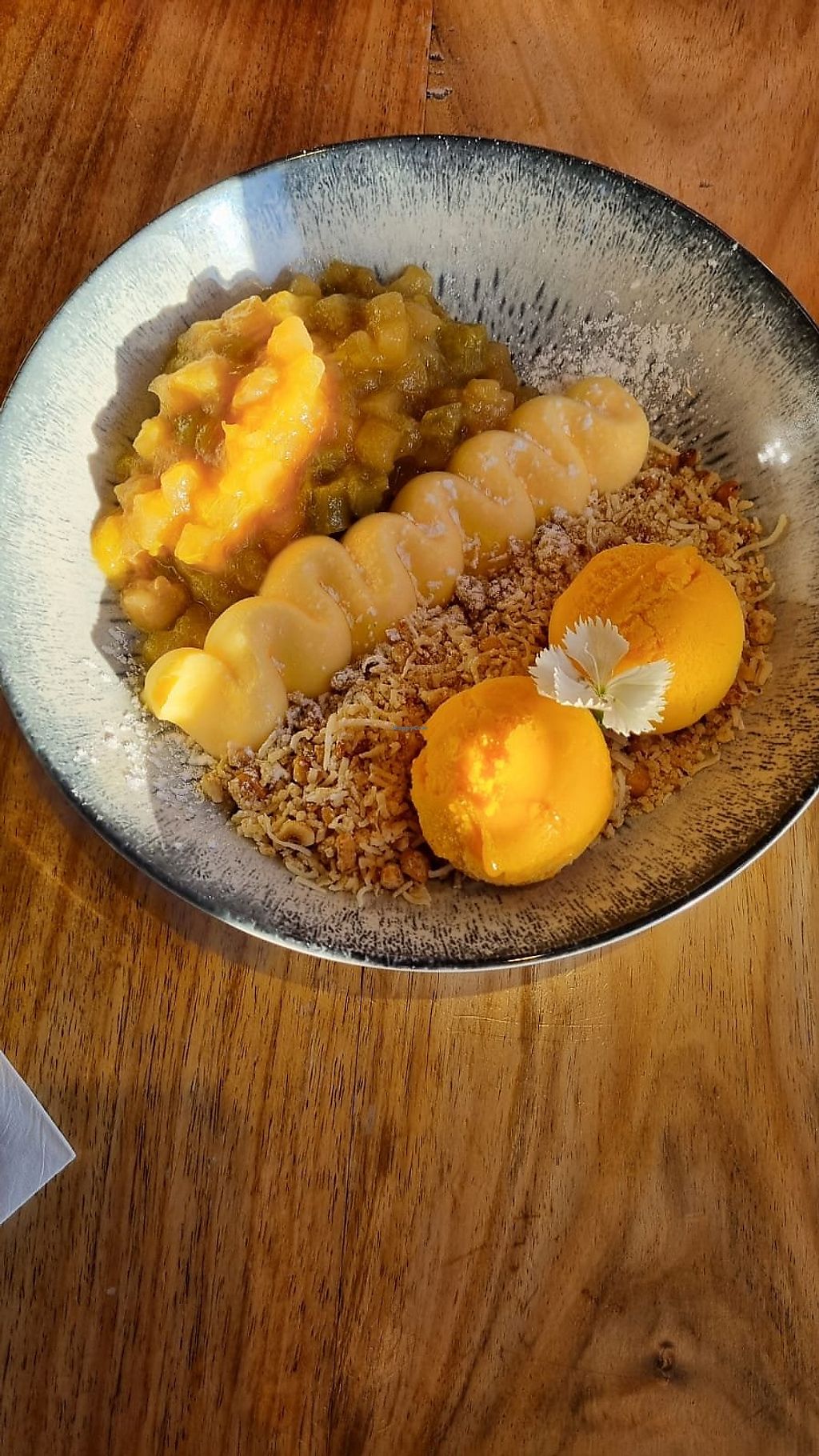 We had the vegan fish and chips made with banana blossom, and it was the first time we tried it — absolutely delicious and a great surprise.