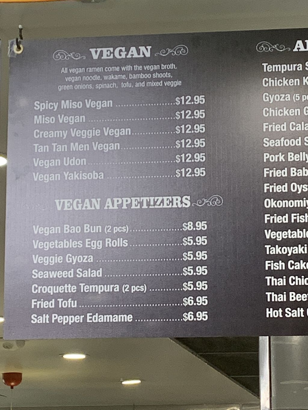 I just tried their ramen today. When you look at their menu you're unclear if they have vegan ramen or not but they do have a lot of dishes with vegetables. I asked and many of their dishes can be made vegan, so there are several vegan options here. I ended up with their Spicy Miso Ramen which was super delicious! It was made with spinach ramen noodles, vegetables, and spicy but not too spicy.