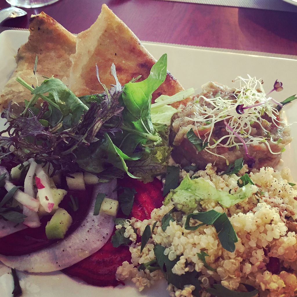 Crème de polenta, légumes confits, sauce verte, coriandre, grenade