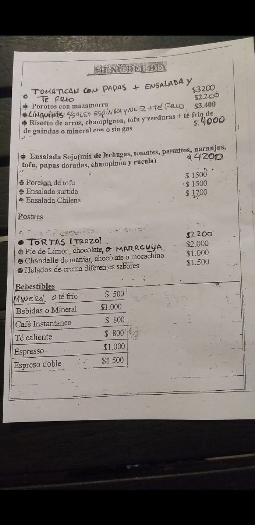 The day I went, the restaurant had five choices for a meal of the day, each one with a different price. One choice was risotto with vegetables and tofu. I saw that at a nearby table and it wasn't creamy risotto made with arborio rice... It was just rice with vegetables and tofu. The plate that I got was mock meat cut in tiny cubes with peas and carrots and mashed potatoes and a simple salad and a glass of tea. The price of what I got was 3200 pesos in January 2018. Each one of the five meals of the day appeared to be just very boring, uninspired food. The place is very busy and if you get there after 1 and before 2:30 you have to wait in a line to sit at a table. Maybe Chilean people like this type of food but I've had so much better elsewhere. Once was enough for me.