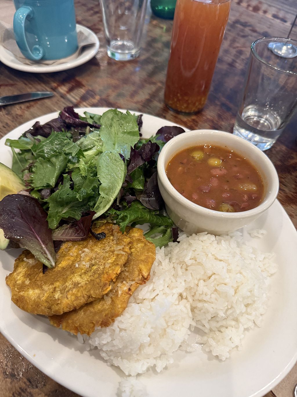 Got the Vegetarian Combinación plate which defaults vegan and it is sooo so good. Tostones! Amazing beans and rice! Fresh salad mix, and the pique salsa is addictive