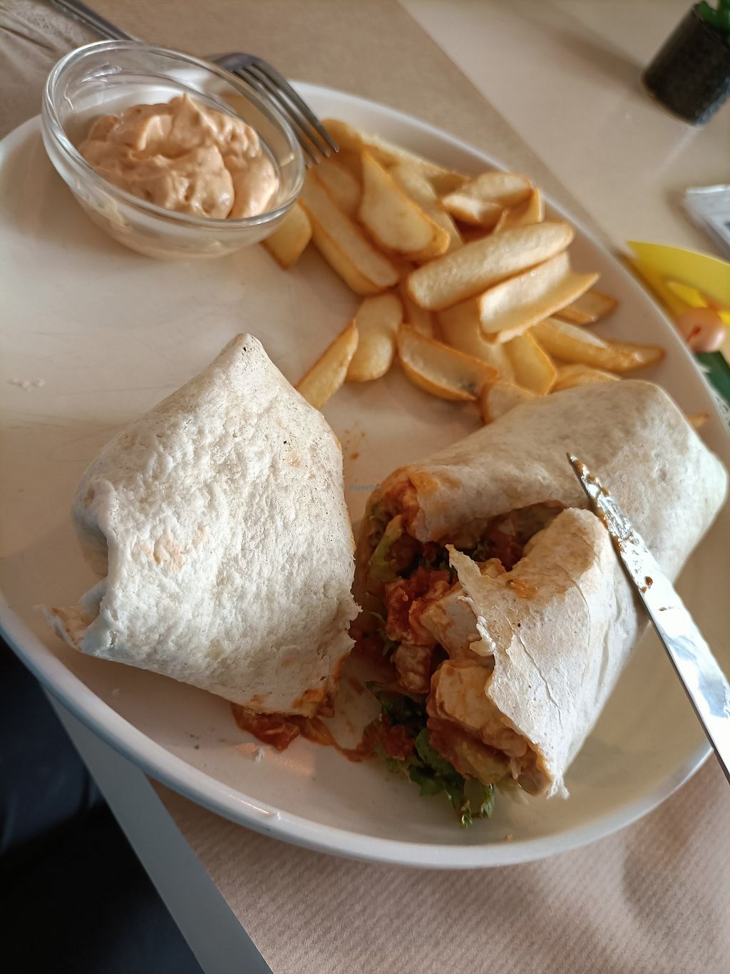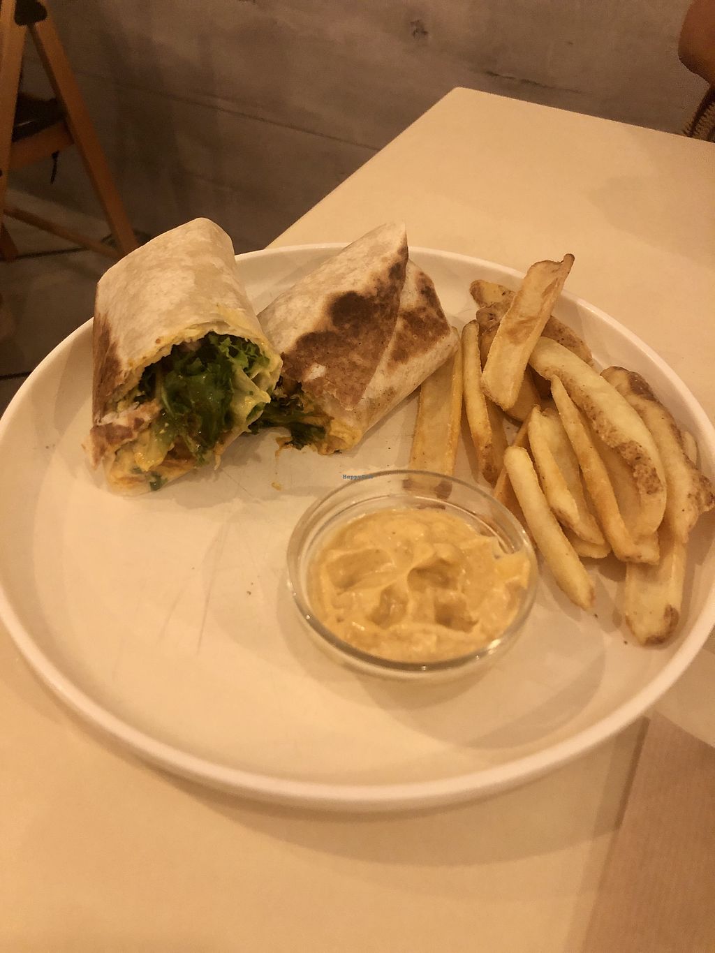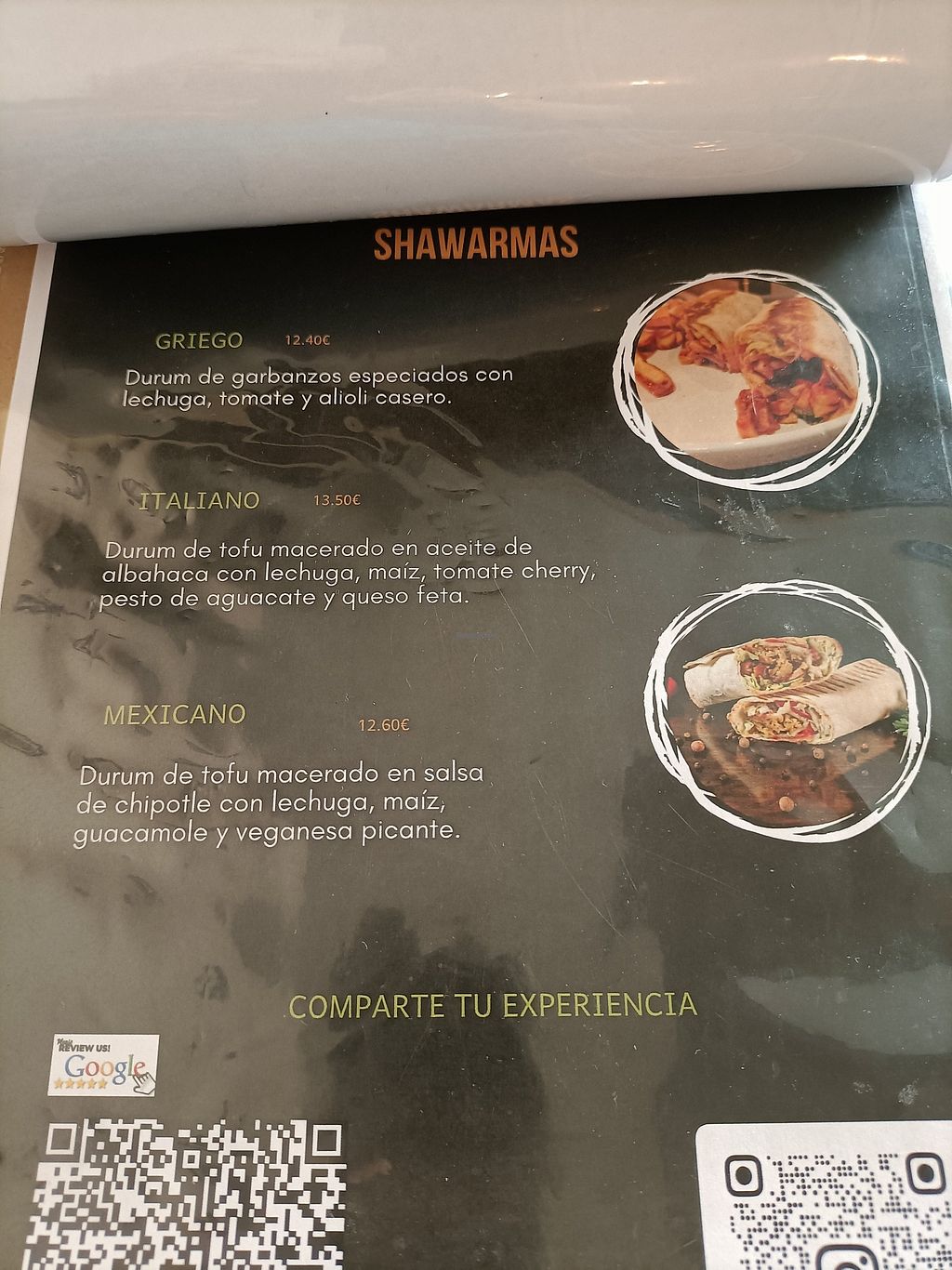 The place has lots of vegan dishes: thai pad, curry, pizza, shawarmas etc. They have dishes with tofu, seitan, tempura and plat-based milk. I had a mexican shawarma. A wrap with tofu, spicy sauce, salad in it and chips.