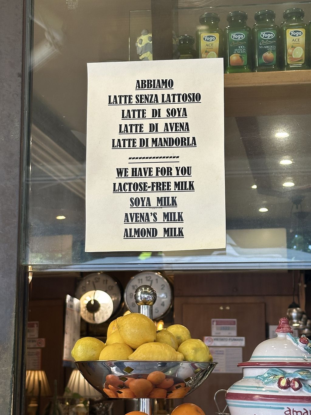 They have clearly marked allergen notices, but that seems to be the law in Italy. There are vegetarian options but for vegans the options are limited, just like any other Italian restaurant. Waiters are rude.
