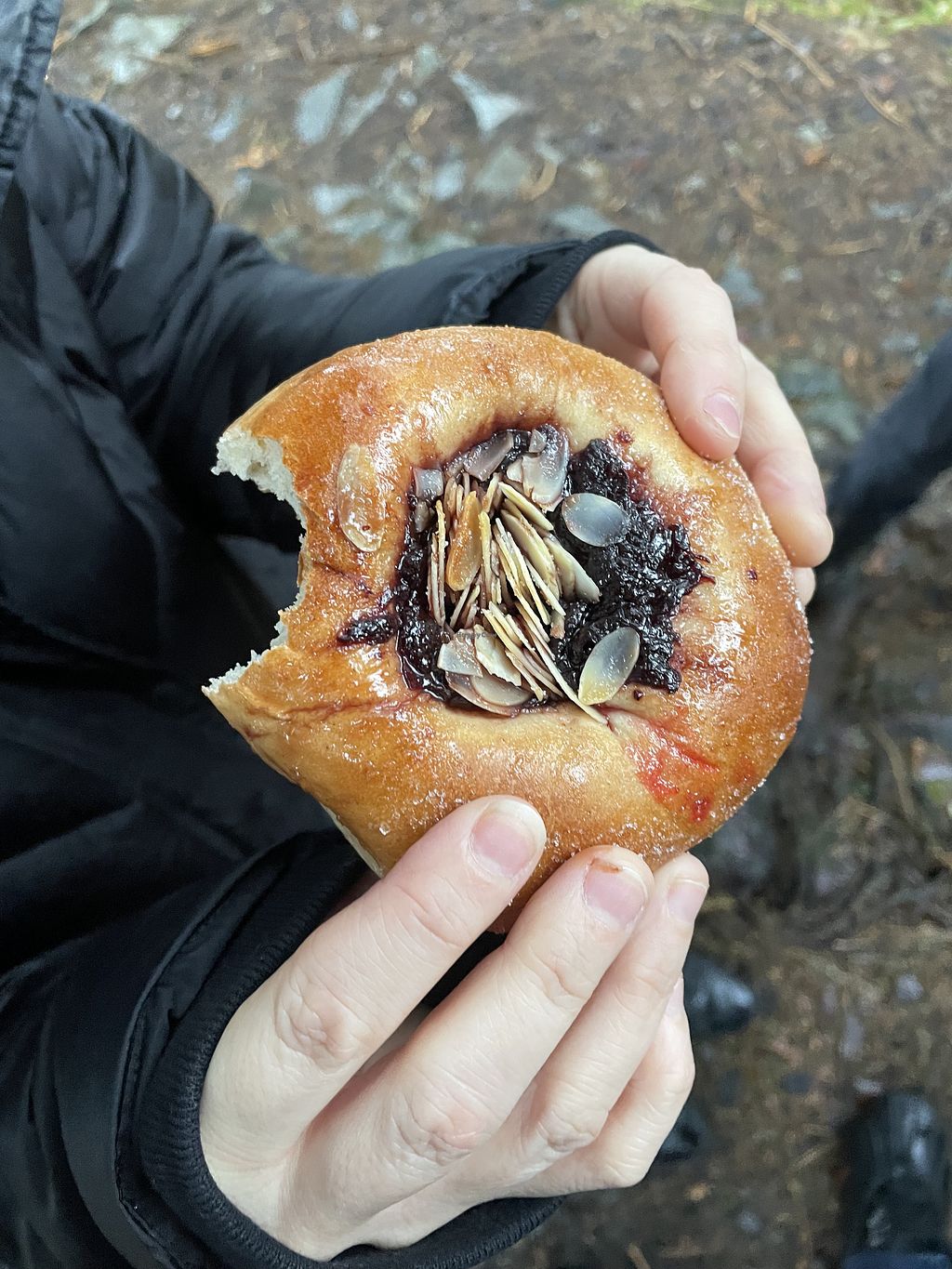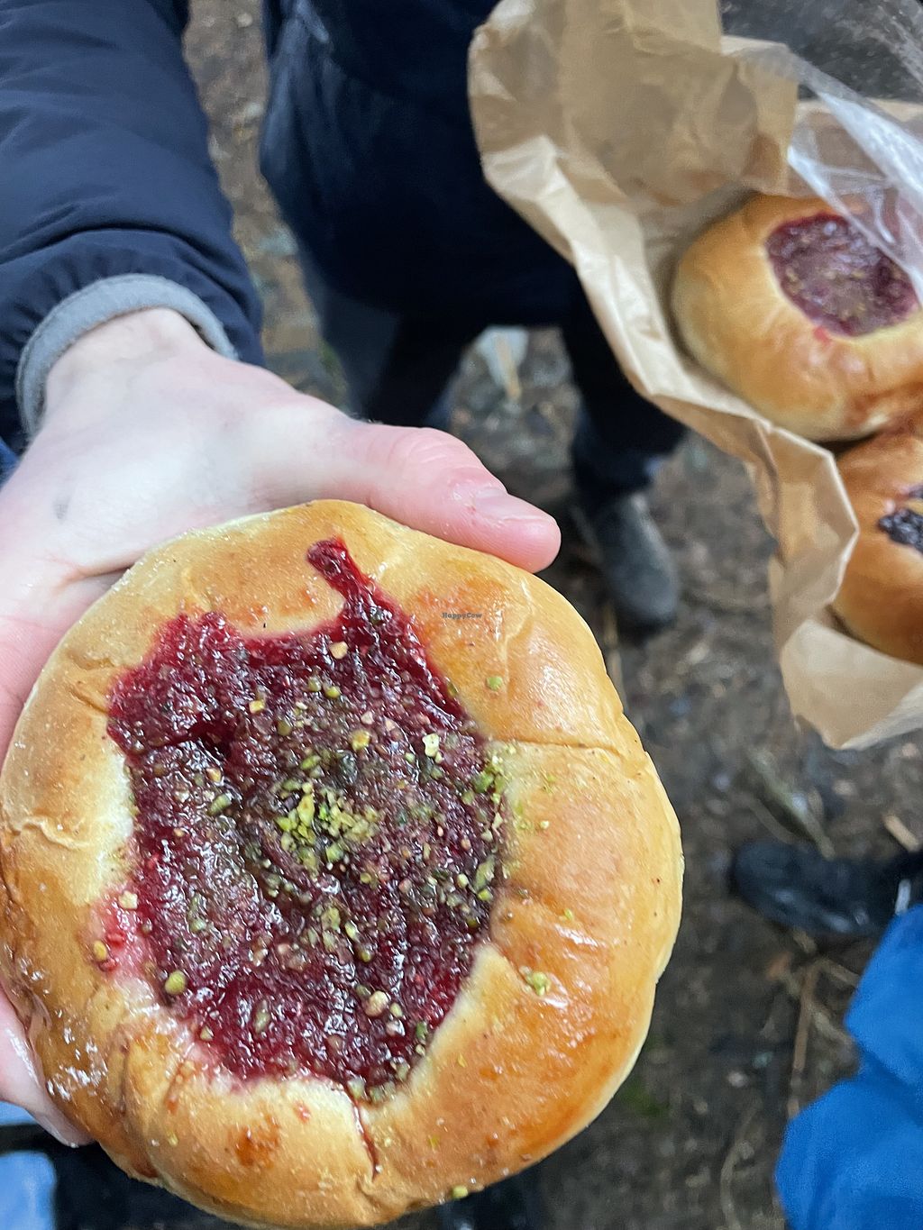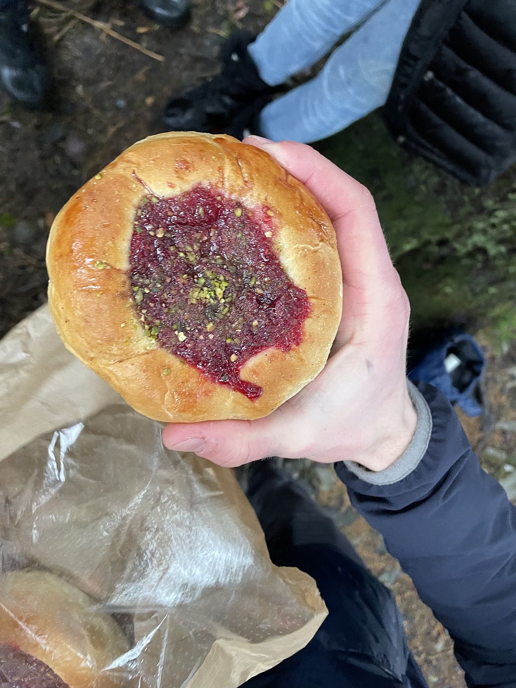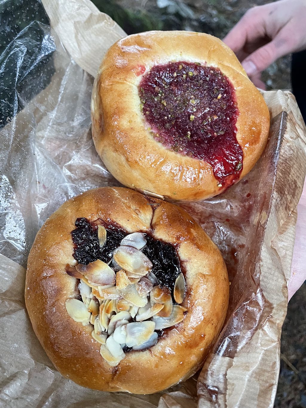 Stopped to pick up a raspberry-pistachio and a cherry-almond doughnut before our walk up the mountains. Both were very tasty. Like our doughnuts from Happy Donut but with more fillings! The raspberry one was my favourite, but both were great. A lovely sticky snack for out and about.