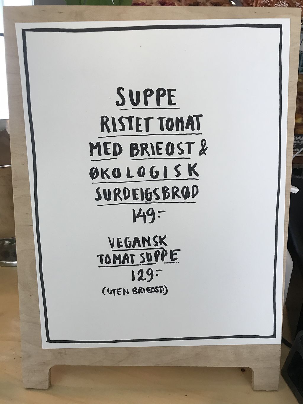 On a cold Norway day we both had soup and sourdough bread. Very good and tasted homemade. Little expensive like a lot of places here but still a good stop. Some of their desserts are also vegan! The cinnamon rolls were sold out but the other roll and the chocolate tart are both vegan and look delicious.