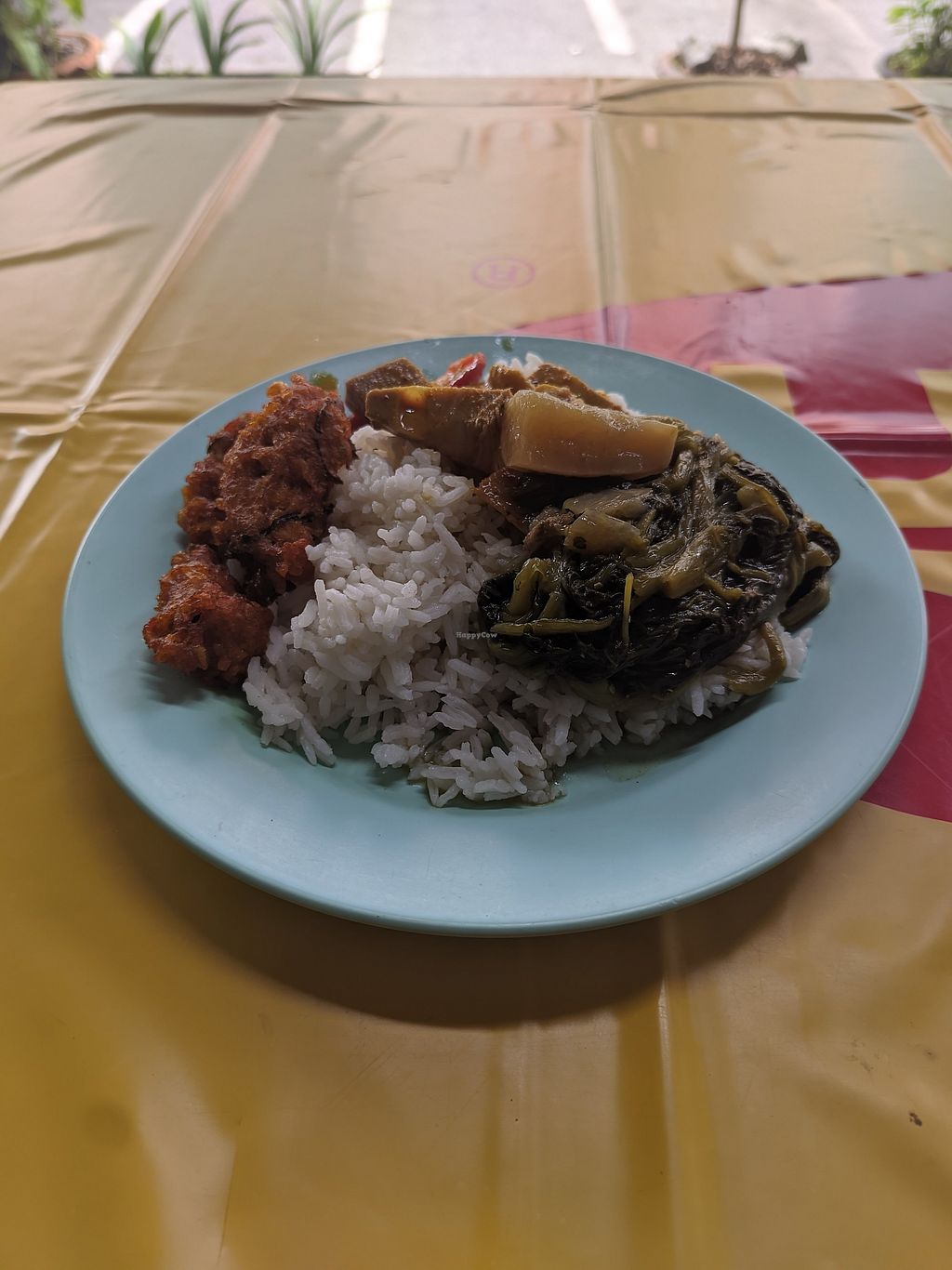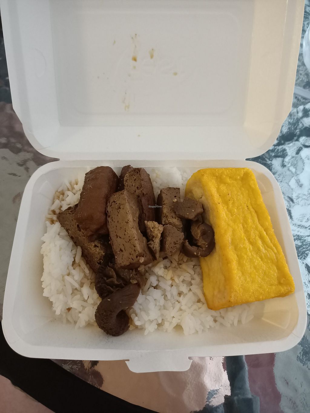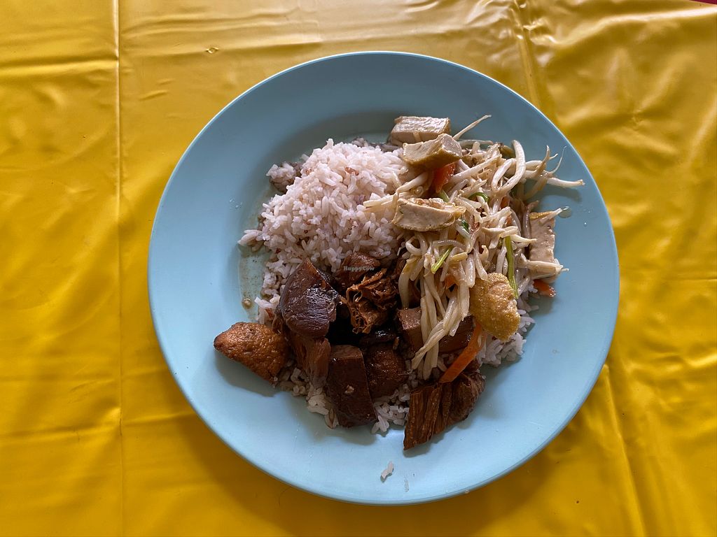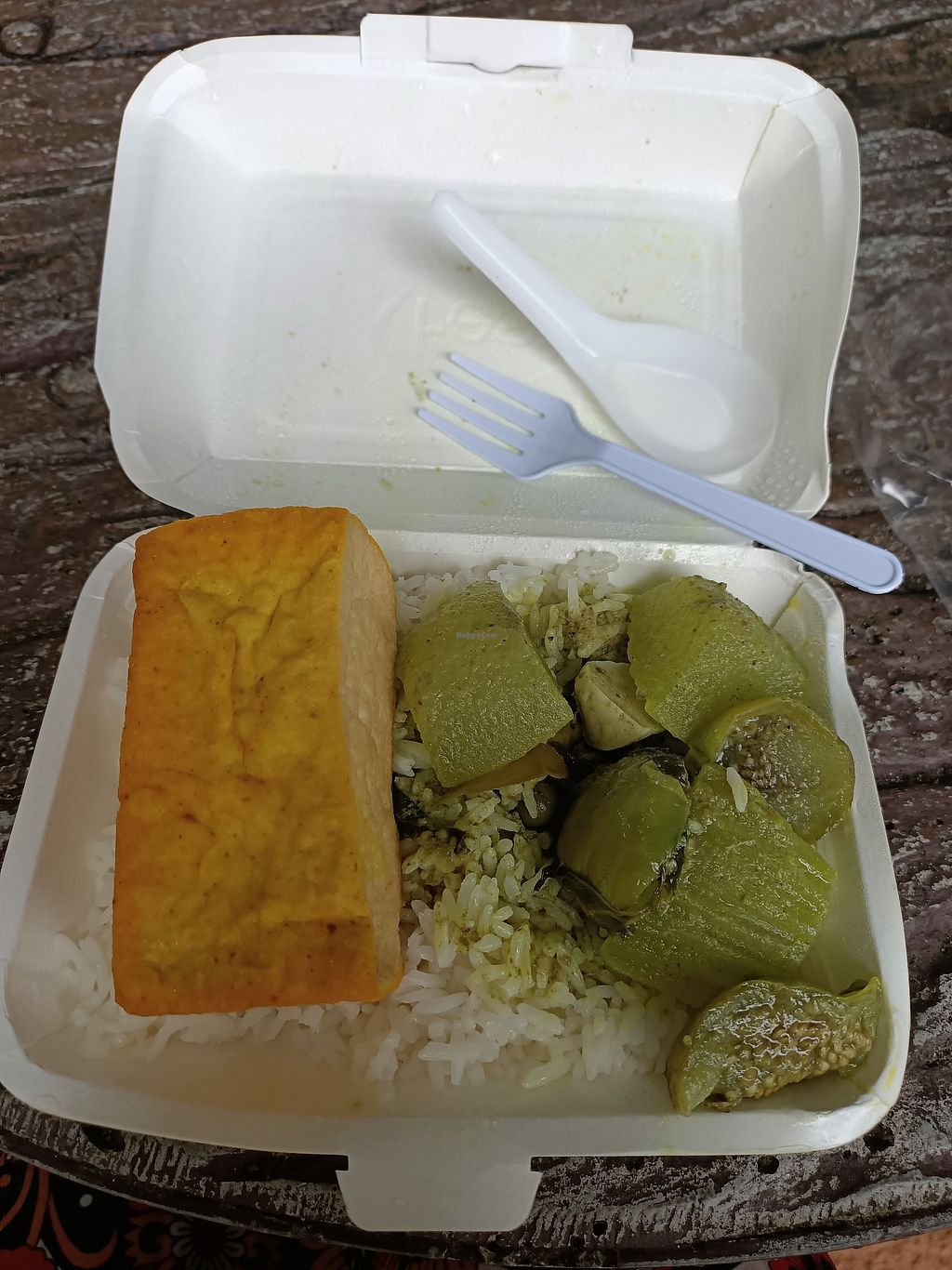 We discovered this vegan stand while walking around. They close really early so we decided to take the lunch for take away. We ate here 2 times and it is true that the price is a little bit random. The first day payed 50 THB per rice 2 toppings, the next day we payed 60 THB for exactly the same.