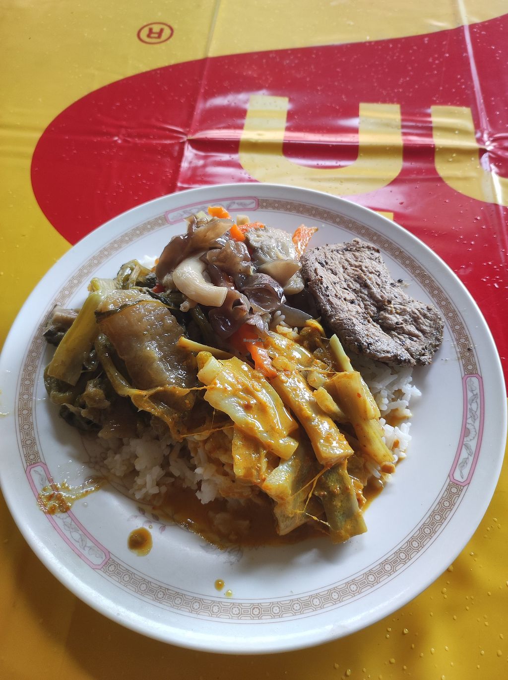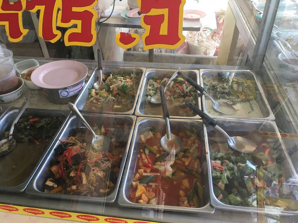 Quite a lot of dishes to choose from with or without rice. Fresh water and ice provided as well as a plate of fresh veggies. Food very tasty and a good amount of spice. Paid 80 Baht for the plate - it kind of seems like everyone is paying a different price?