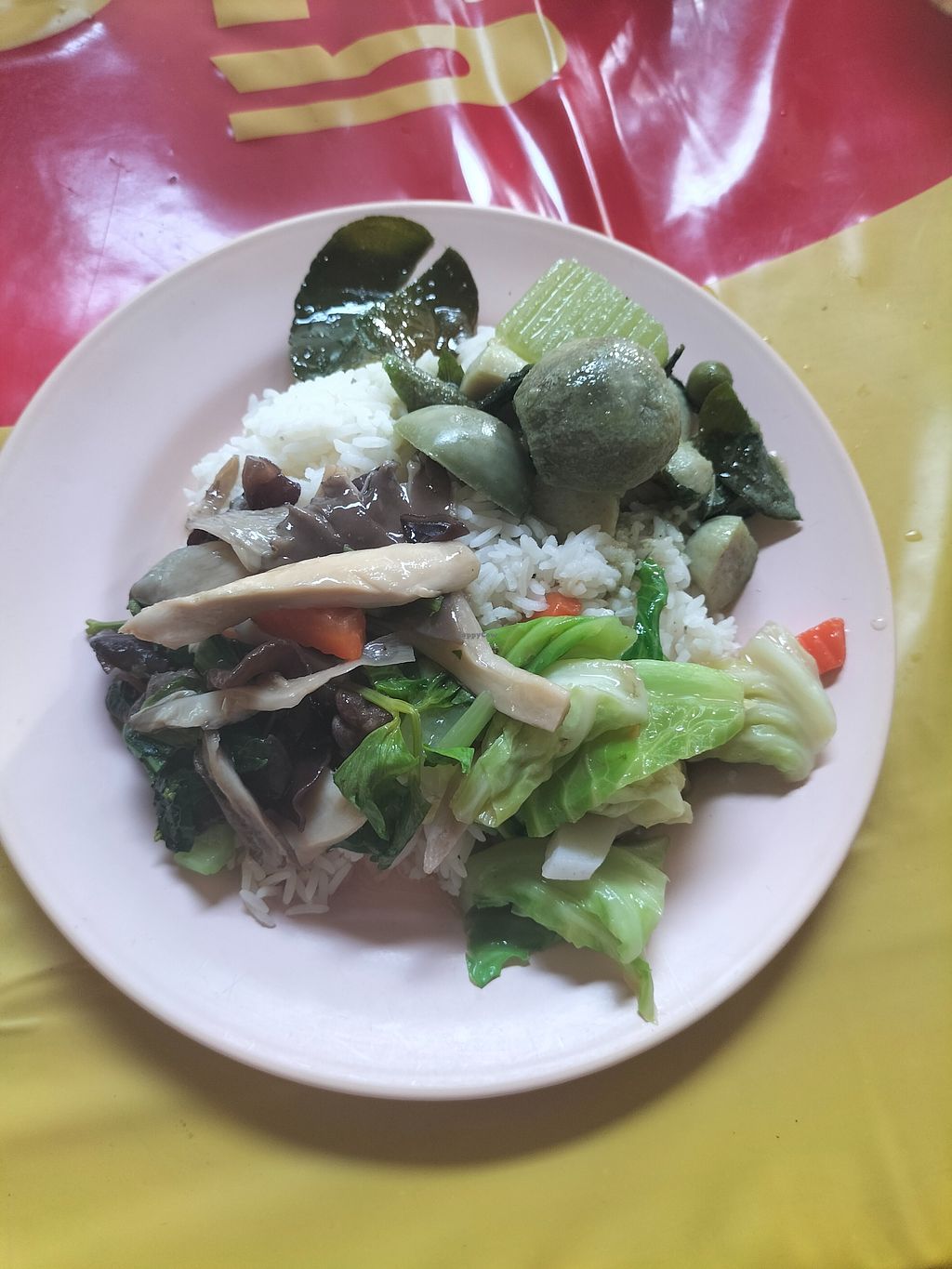Delicious vegan Thai foods for good price. Rice with two toppings just 40 Baht. Additional greens like herbs and cucumbers are for free. Water with ice is for free as well. Lady serving seems to be shy but very friendly!