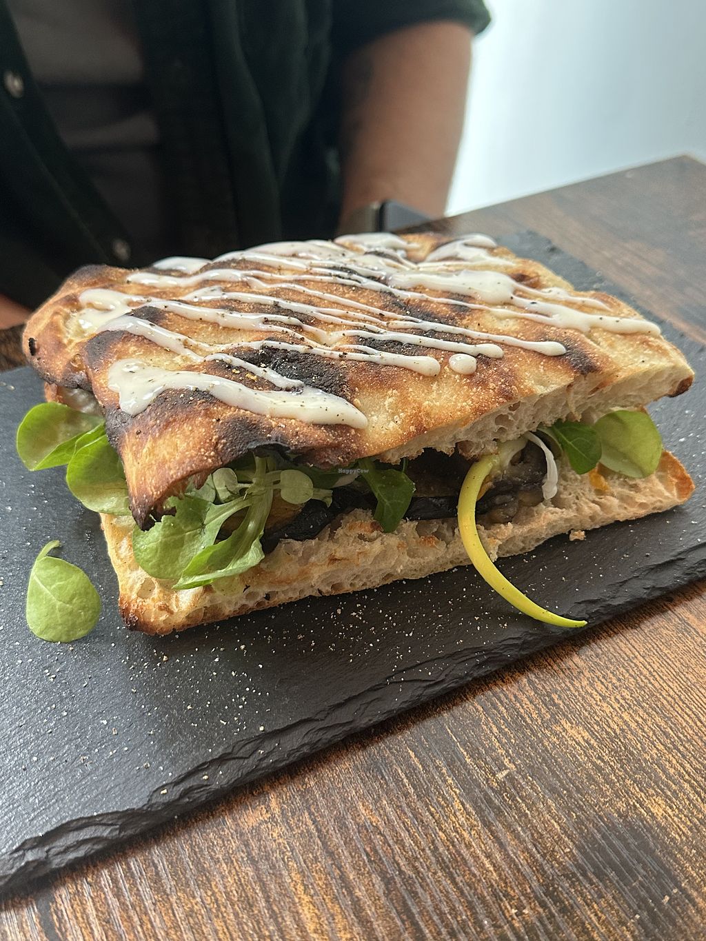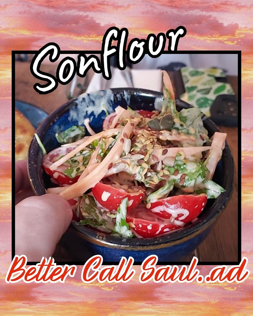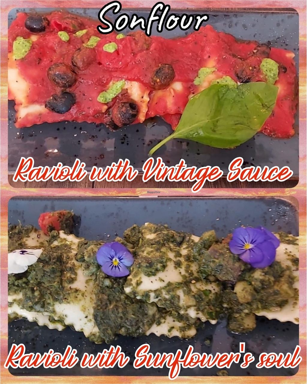 Ravioli with pesto, BBQ tempeh, and George Constanza salad