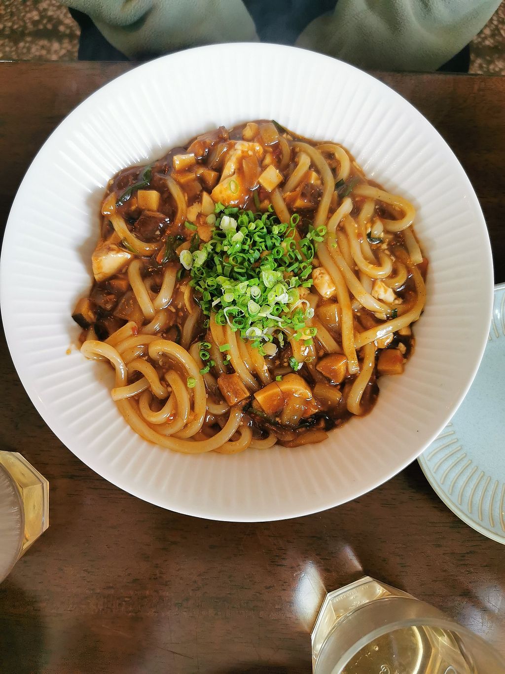 Vegan mapo tofu udon noodles: generous portion with lots of mushrooms …