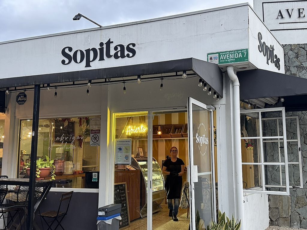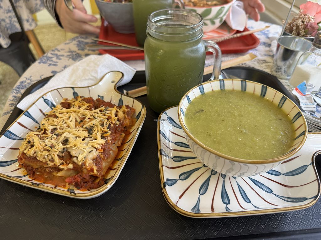 Sopa negra, pupusa, jugo de mango y maracuyá