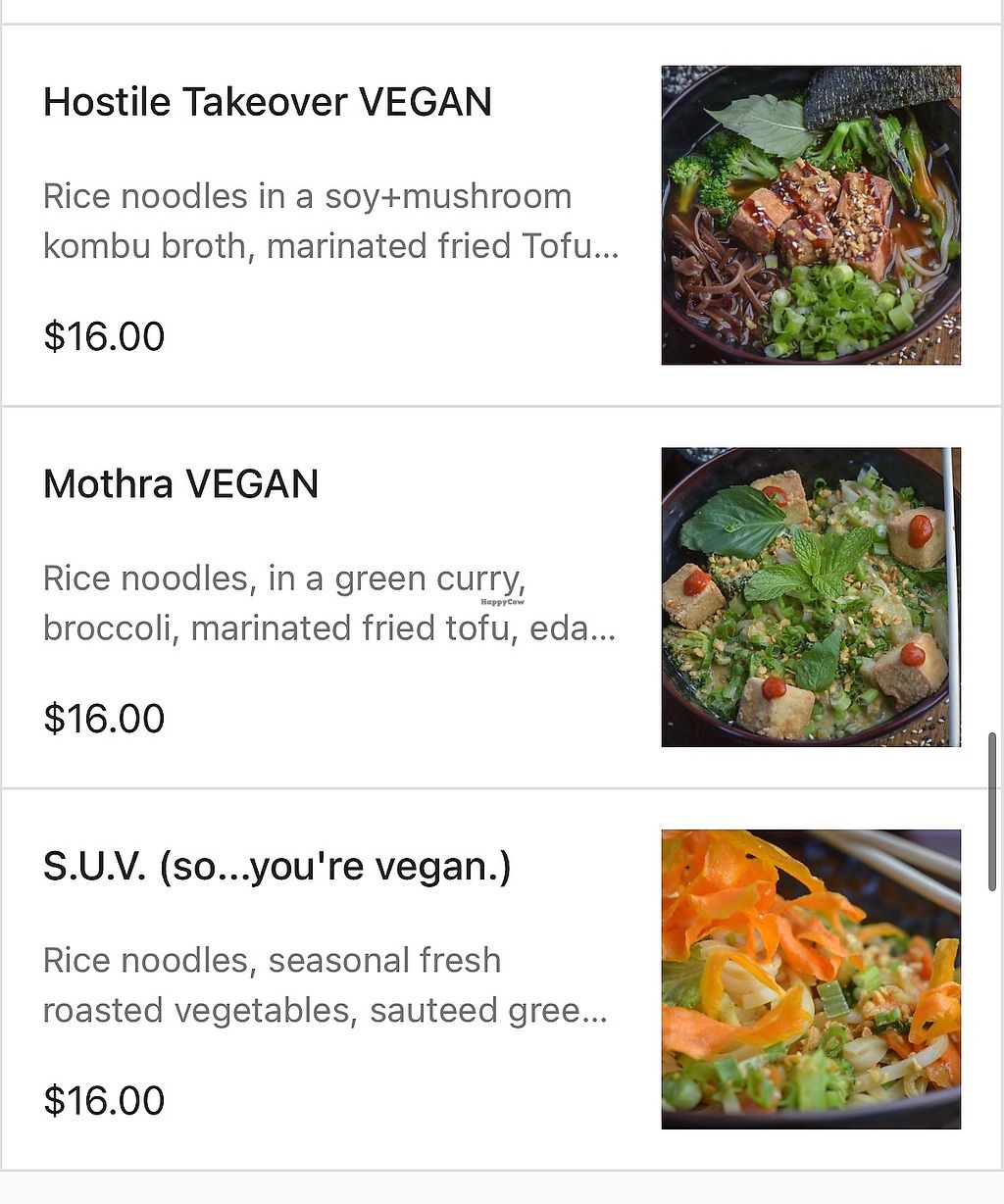 Got the SUV (so you're vegan)- only vegan noodle bowl and it was salty and not flavorful. $15 for the bowl and $5 extra if you want to add tofu.