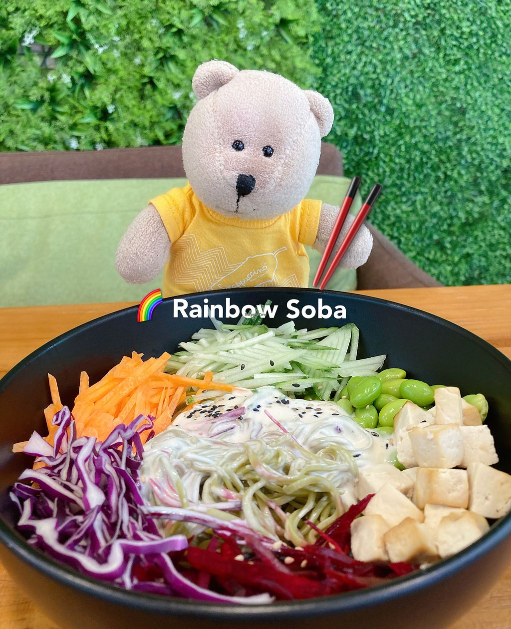 Ordered Rainbow Soba, Buddha Bowl, Sweet Soy Glazed Lotus, Sunmer Hydration (watermelon juice) and Flat White for $34.50. All are vegan plant based foodie!😍 there's onion sign on the menu, indicating what items have onions... Food are yummy and I would recommend abovementioned except for the coffee...likey the sesame rainbow soba bowl a lot! Also do note that the wait time can be urghhhhhh on Sunday lunch timing. It was full house and we waited 40-50mins for everything to be served. 😪. To the least, I feel that drinks could be served first, rather than coming after food. Go earlier or be more patient if you want to try their foodie.