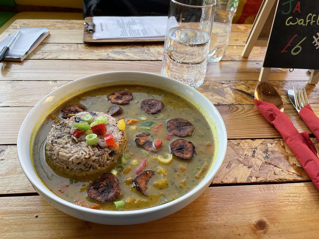 Serves meat, vegan options available. Caribbean inspired restaurant and takeaway. Offers vegan and vegetarian dishes labelled on the menu. Includes a veg platter for one or to share, vegan curry with rice and peas, jerk chicken style burger, veg wrap and fried and plantain and hash brown wrap. Open Tue-Thu 12:00-20:00, Fri-Sat 12:00-21:00. Closed Sun-Mon.