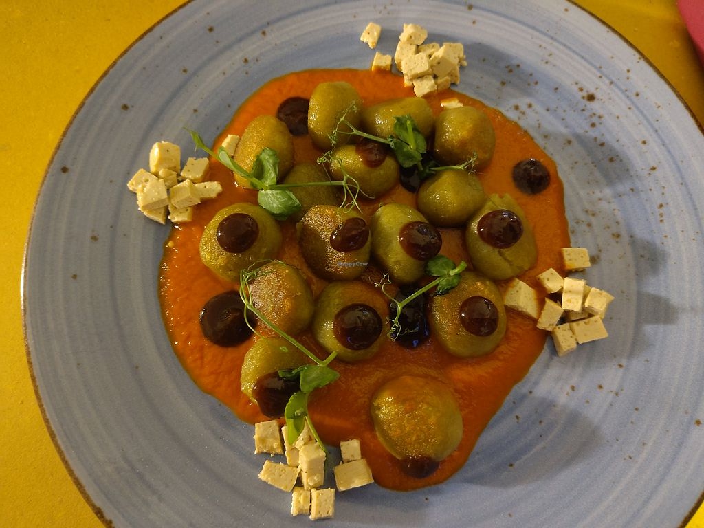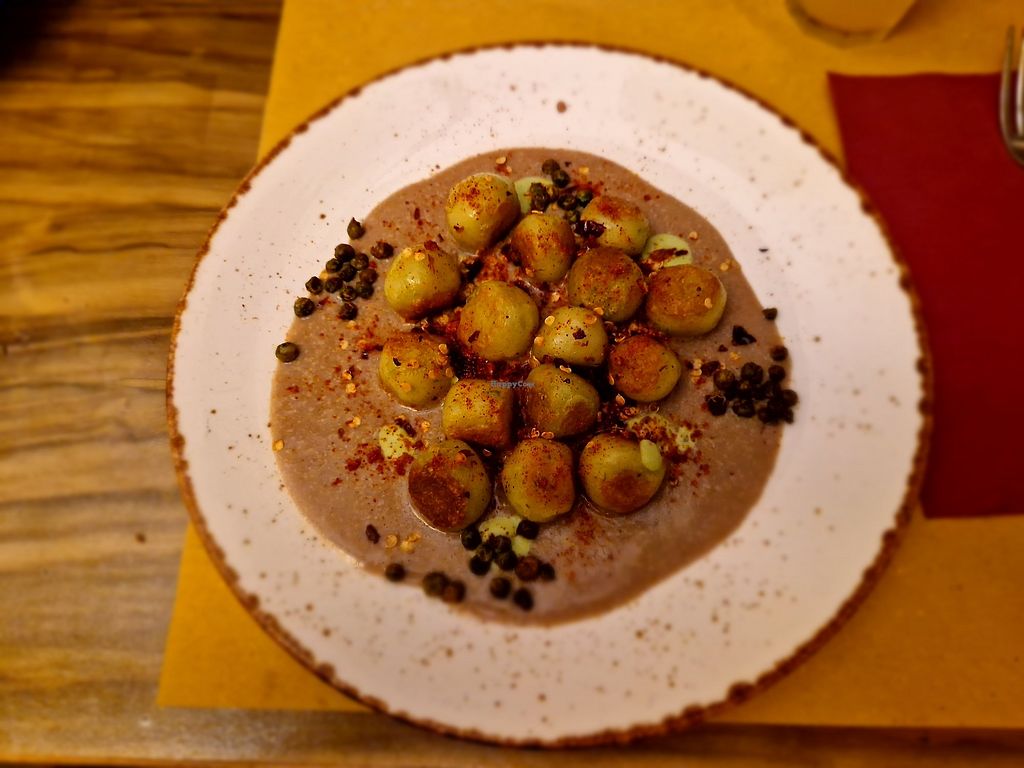 Green peas gnocci, black garlic, pepper chips