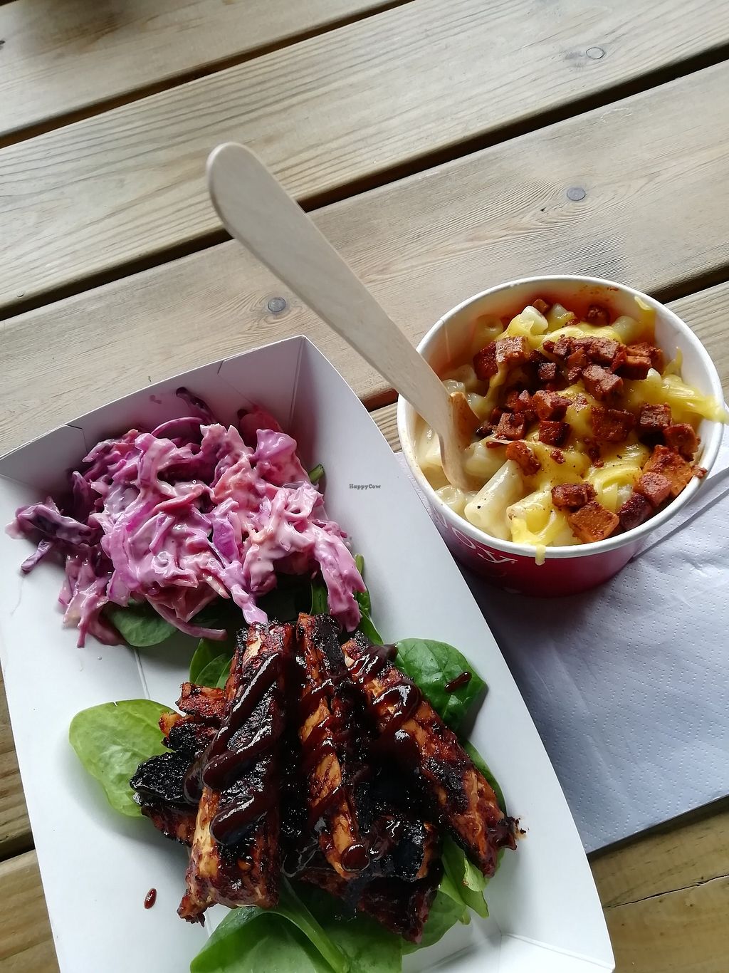 Mac no cheese very tasty. Louisiana bbq tempeh ribs very nice, slaw great. We would come back to try other menu items. Nice to be able to sit for a bit with a brew dog on the picnic table.