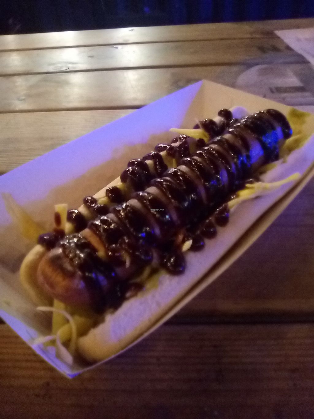 I got the Naughty Dog hot dog & loved it. It came covered in BBQ sauce with jalapinos, vegan cheese & guacamole, definitely an option to have if you don't mind getting messy.