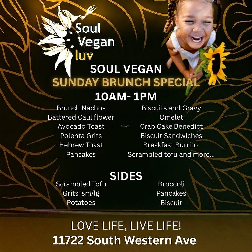 Cafe offering plant-based soul food and international cuisine like lasagna, "Jerk Steak Wrap," "Jerk Tofu Wrap," and various salads including "Carrot Supreme Salad". Other options include "Live Plate Lunch," "Un-Real Chicken Salad," bean curd salad, and pasta salad. Open Sun 10:00am-5:00pm. Open every Sunday
