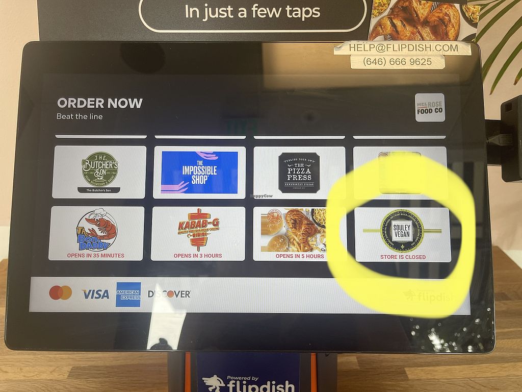 The store is a ghost kitchen. Nowhere to actually sit and eat. It’s takeout only. The store appears to closed or only closed on saturdays? Other options say they’ll be open in 35 or so minutes but it only says Closed on Souley Vegans option. Bummer ):