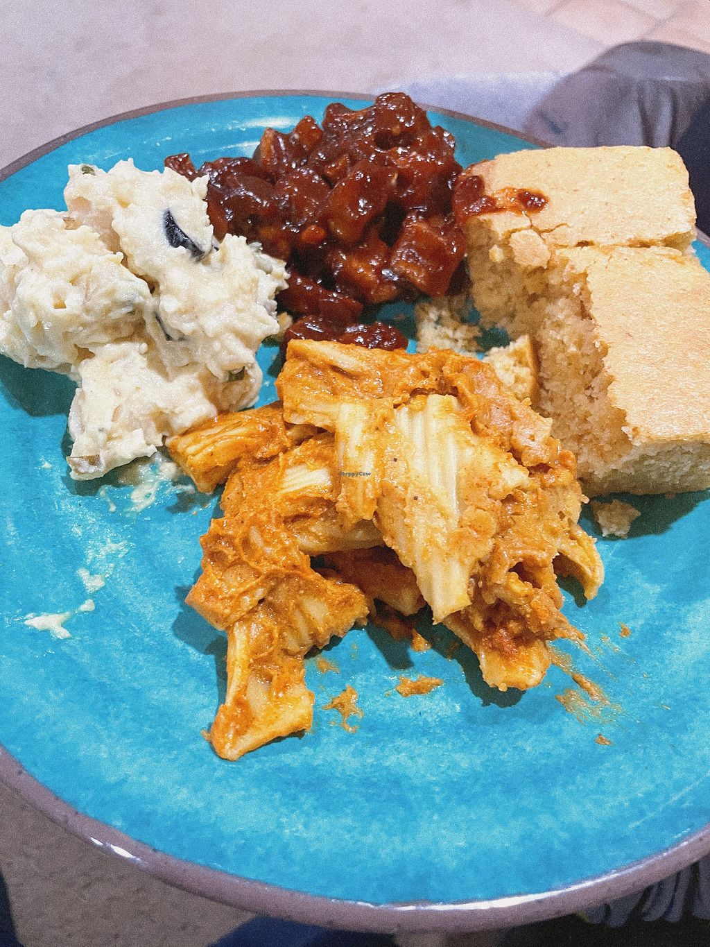 Mac and Cheese, cornbread!, bbq tofu (I hate bbq but I tried it, never…