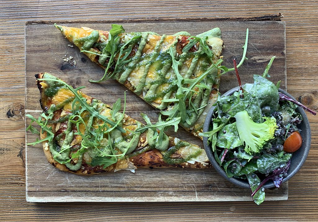 The Souls Burger, sweet potato fries w/ dip. Farthest away: the Pizza …