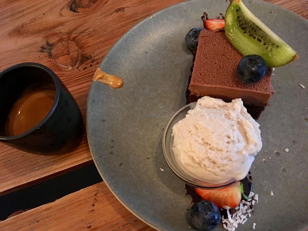 Raw delicious vegan chocolate cake with mango sorbet and dried fruits