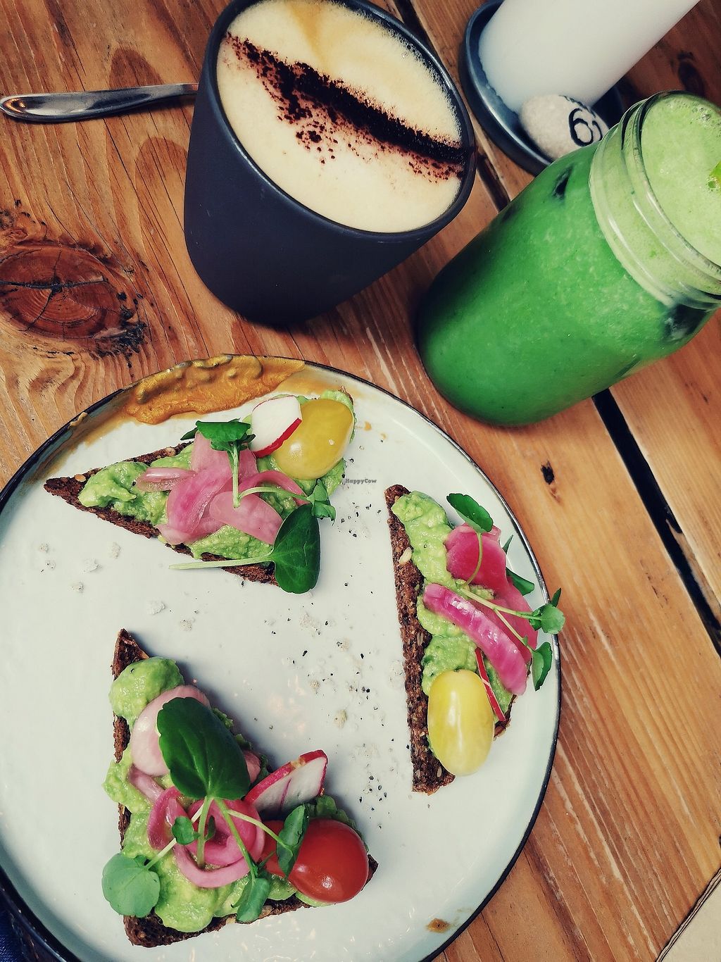 Raw chocolate bite and cappuccino. Raw chocolate cake and an Aussie le…