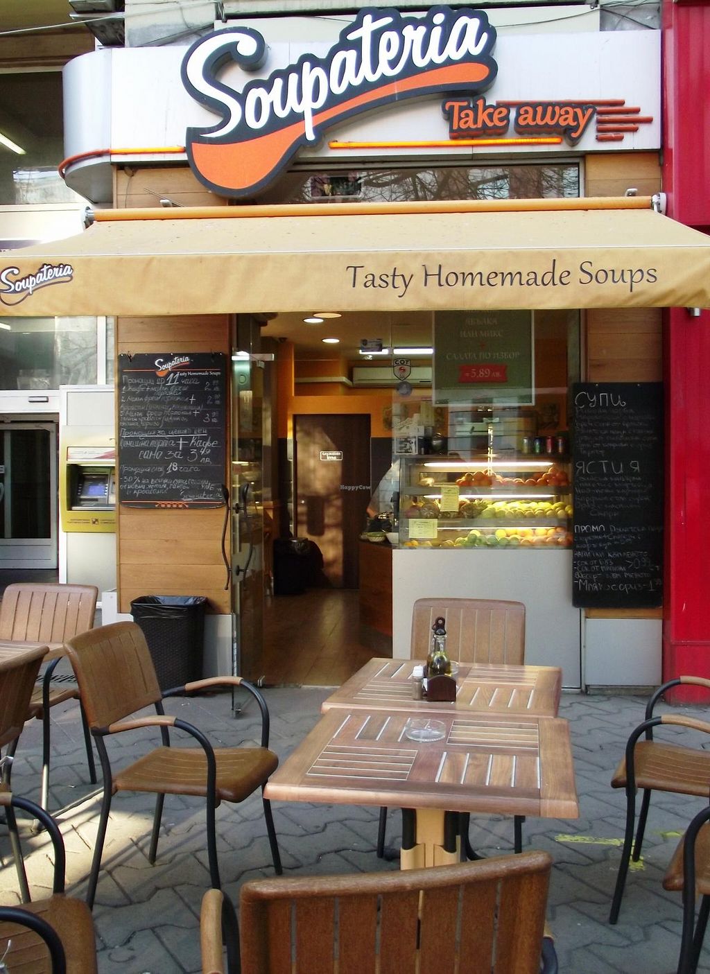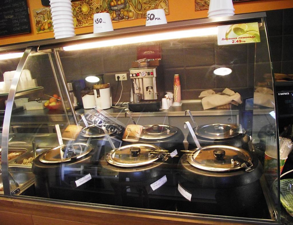 Serves meat, vegan options available. Located in the heart of Sofia, at Soupateria you'll find 6 types of hot and tasty soups daily, made from old recipes adapted to your taste. Serves between 2 and 4 vegan dishes per day. Vegetarian food too. Be sure to try the fresh salads, fresh sandwiches with crusty bread and sweet temptations - all made with love in the spirit of true home cooking. Open 24h. Reported closed, Nov 2017.