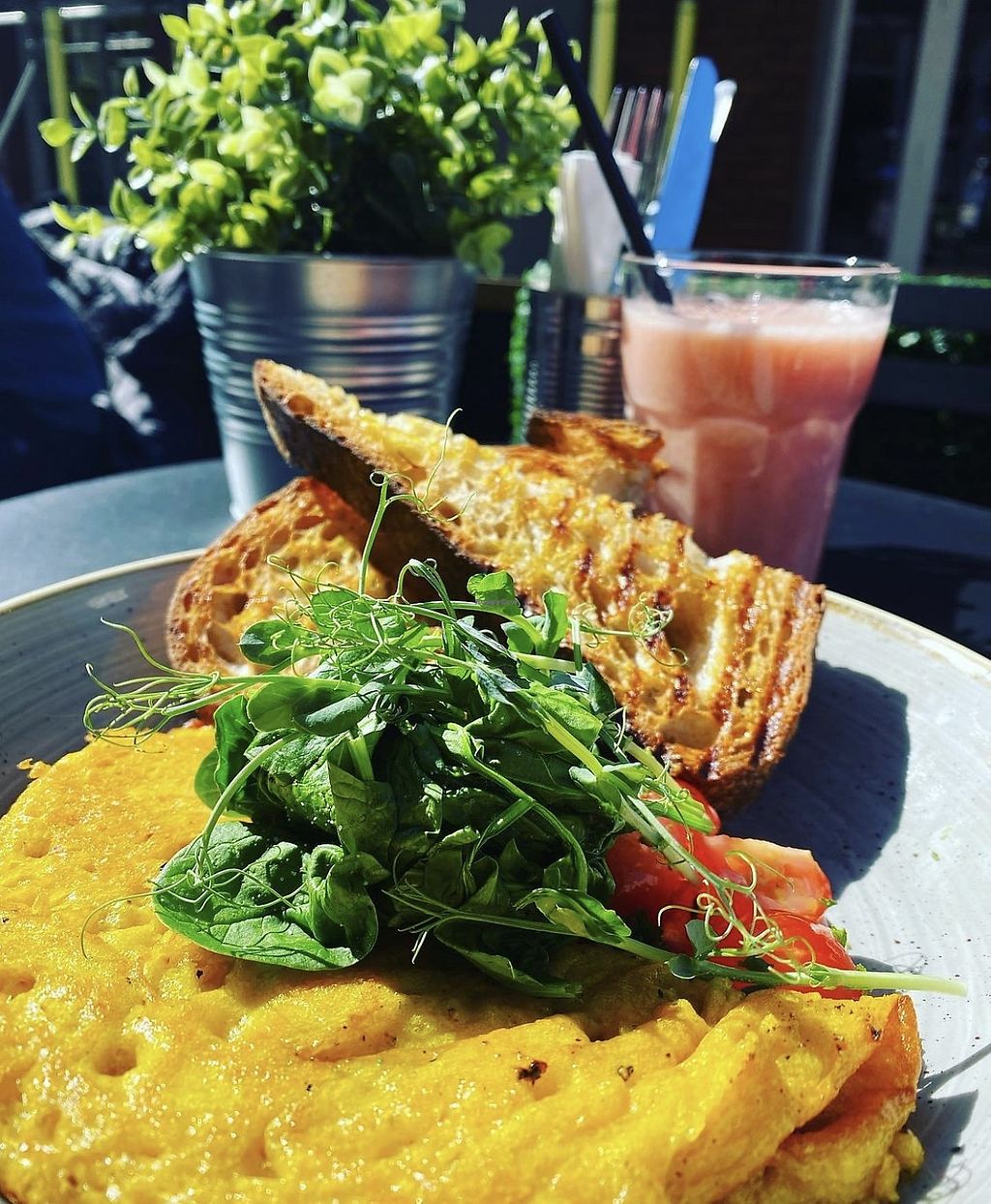 Chickpea omlette with sourdough toast, avocado, black olive tapaende &…