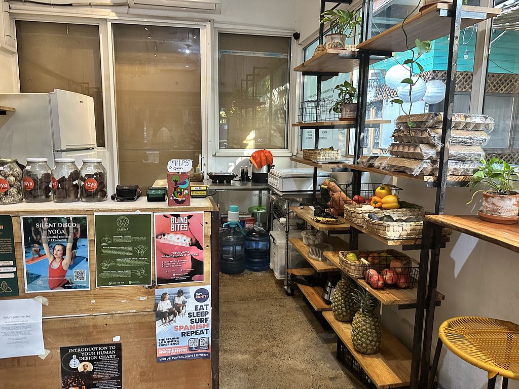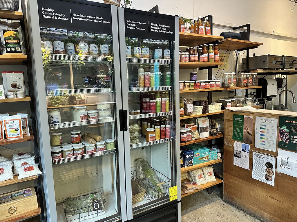 Serves meat, vegan options available. Menu is vegetarian except for a few chicken dishes. Find smoothies, soymilk shakes, vegan ceviche, salads, bowls, pizza, and desserts. Makes soymilk, coconut milk, and cashew nut milk (with honey) in house. They sell a number of products including some vegan cheeses, beauty supplies, and some desserts which are vegan. They also have a location in San Salvador. Open Mon-Sun 8:00am-9:00pm.