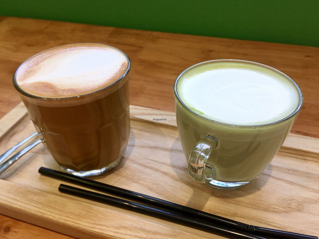 left to right: tapioca pearls, matcha latte, pandan beancurd, cold org…